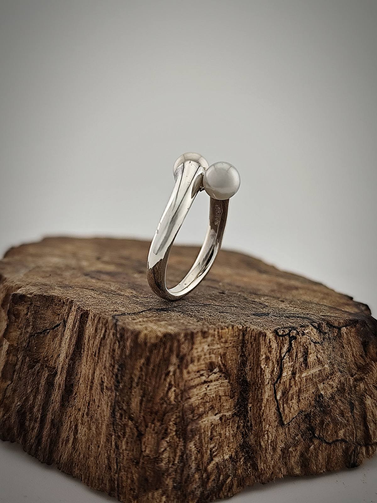 Изработен от стерлингово сребро (проба 925) и естествени речни перли. Всяка перла е подбрана ръчно заради своята форма и блясък. Пръстенът е удобен за носене и излъчва изисканост без излишна претенциозност.