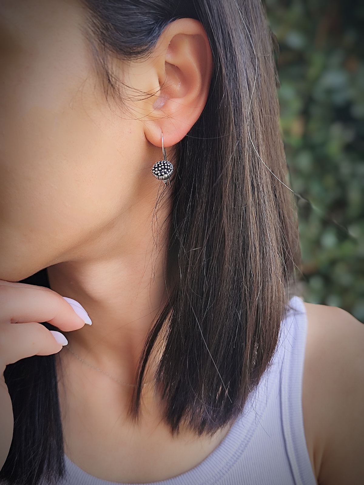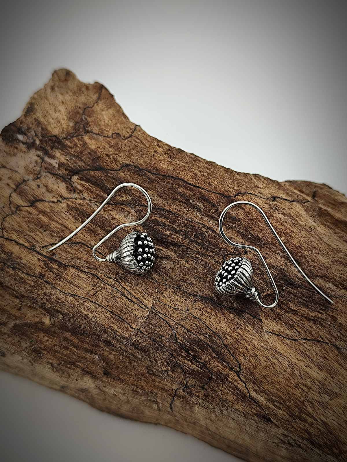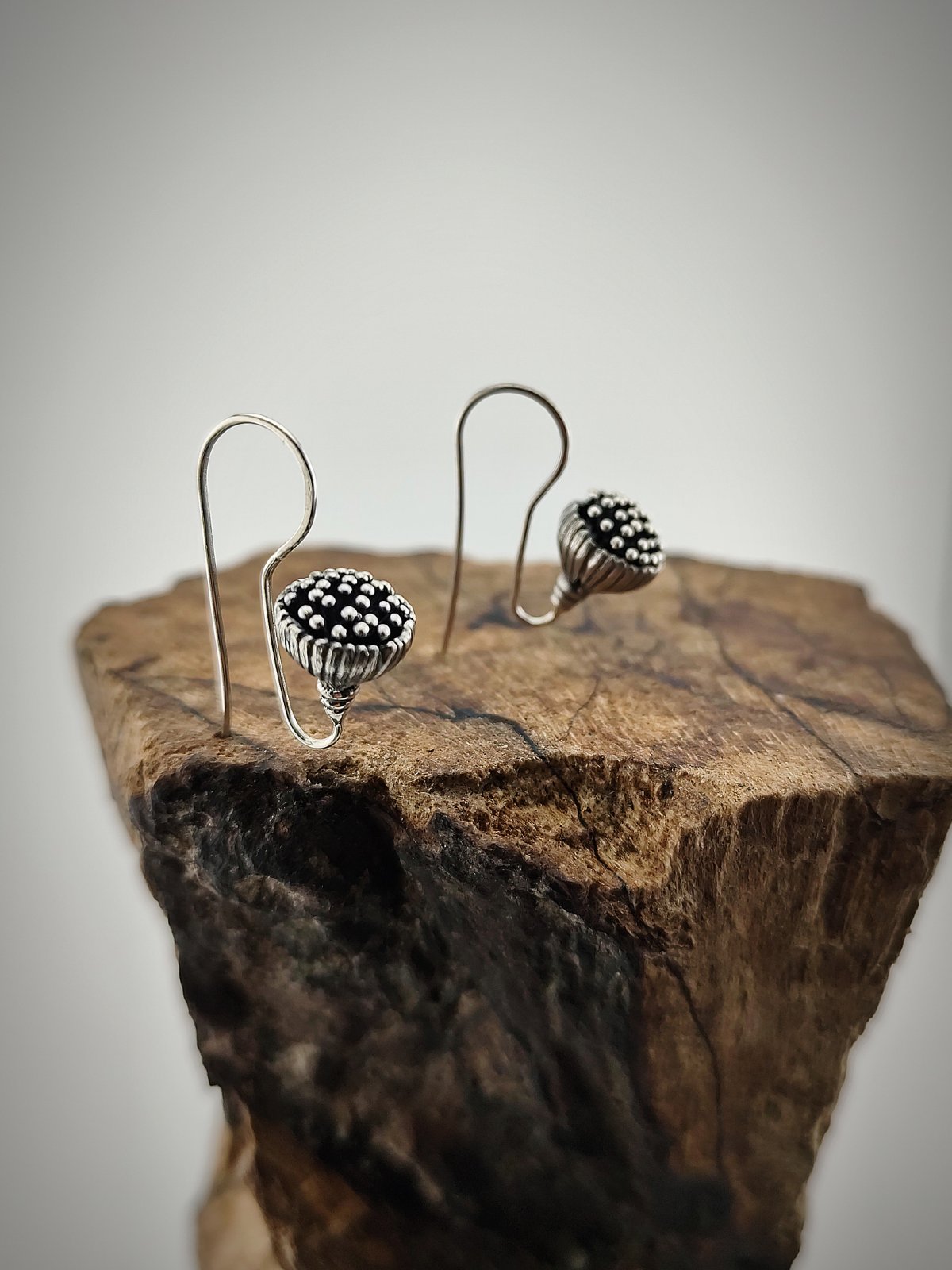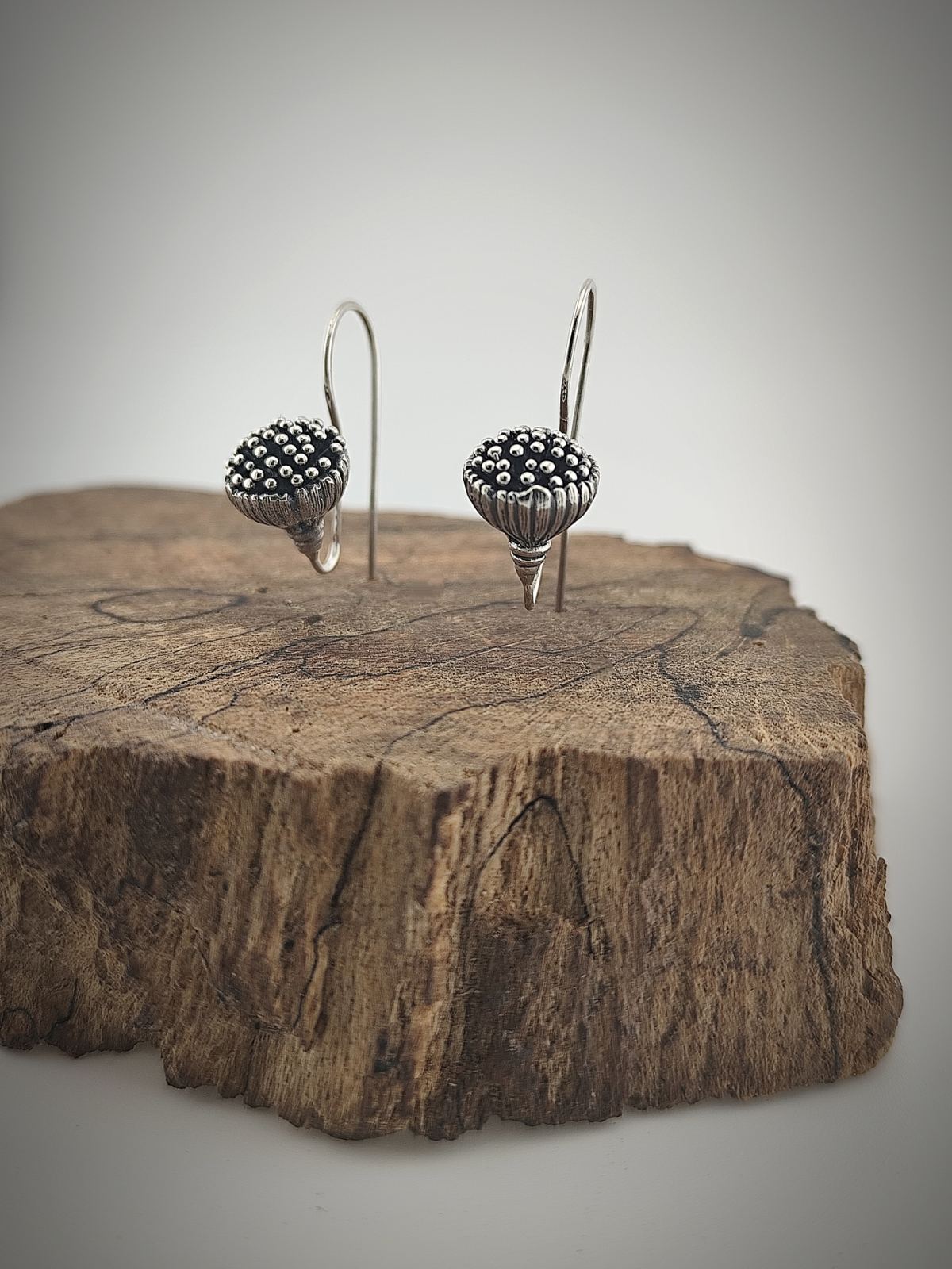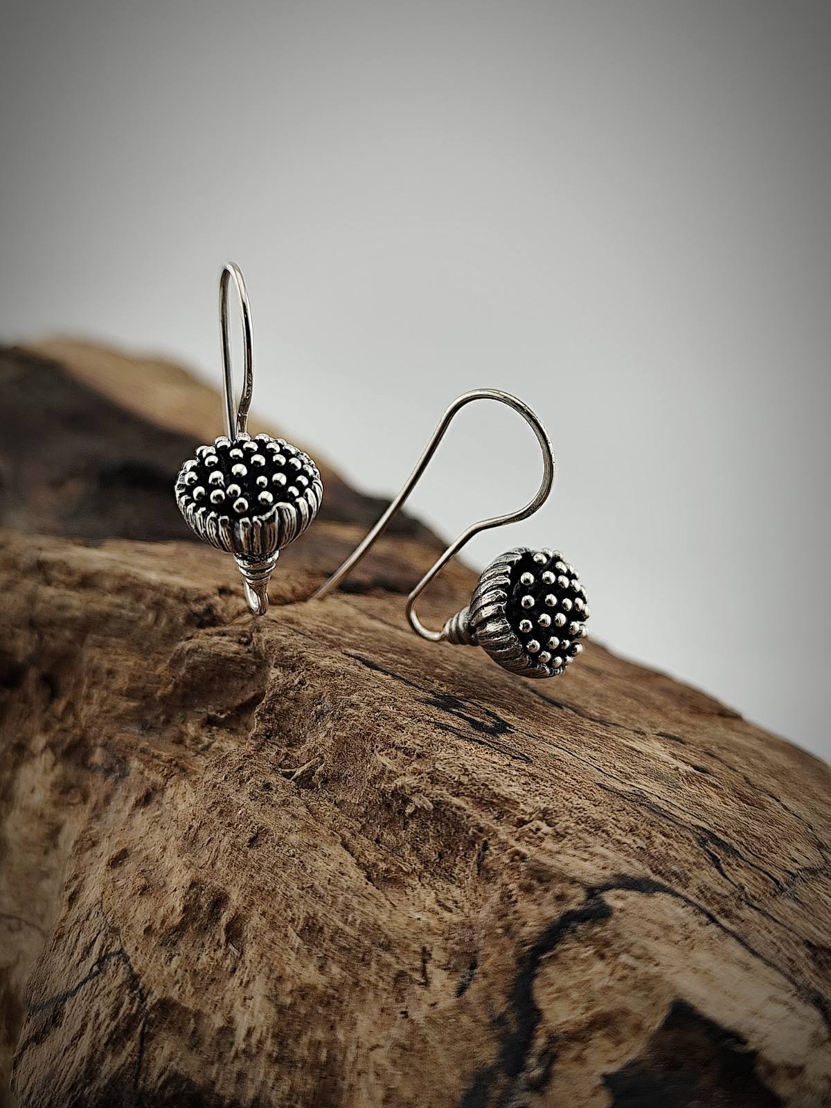 Изработени от стерлингово сребро (проба 925), с внимание към детайла и ръчна патина за подчертаване на текстурата. Леки и удобни, те са идеални за целодневно носене.