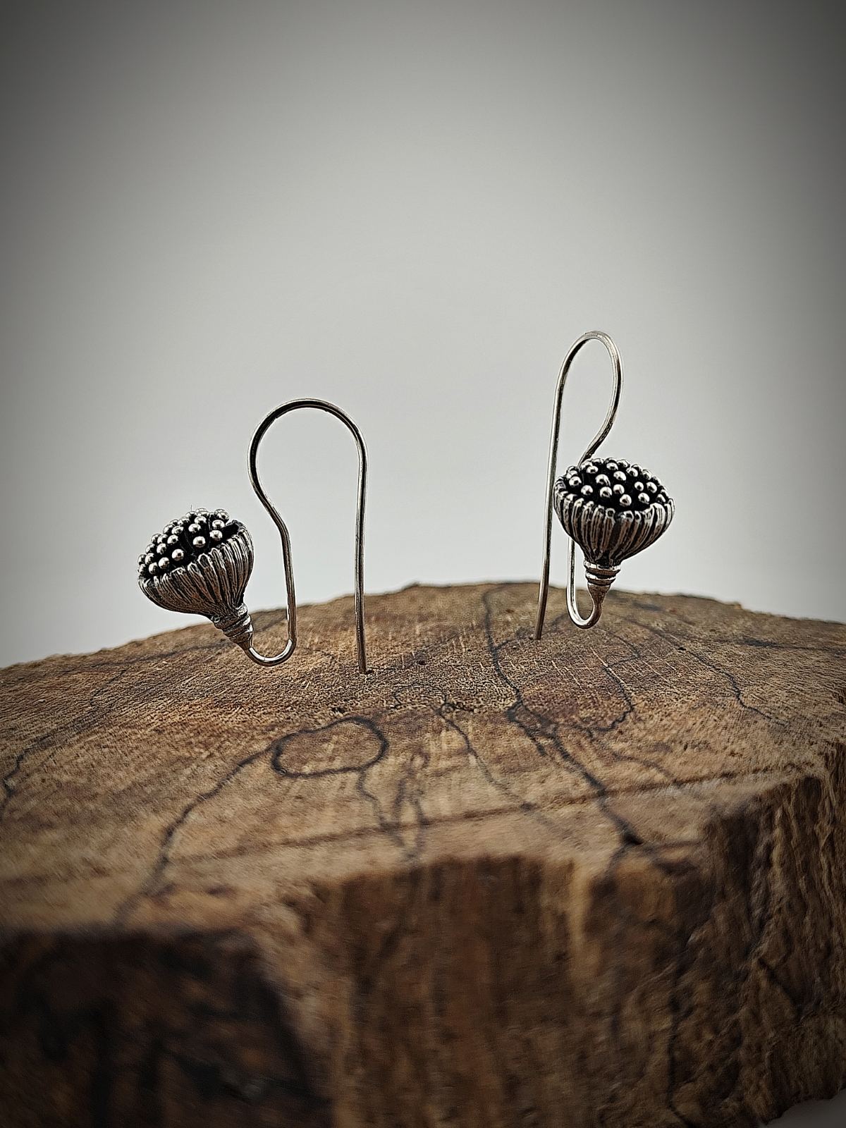 Детайлна стилизация на макова капсула с ръчно патинирани акценти, които създават дълбочина и релеф;