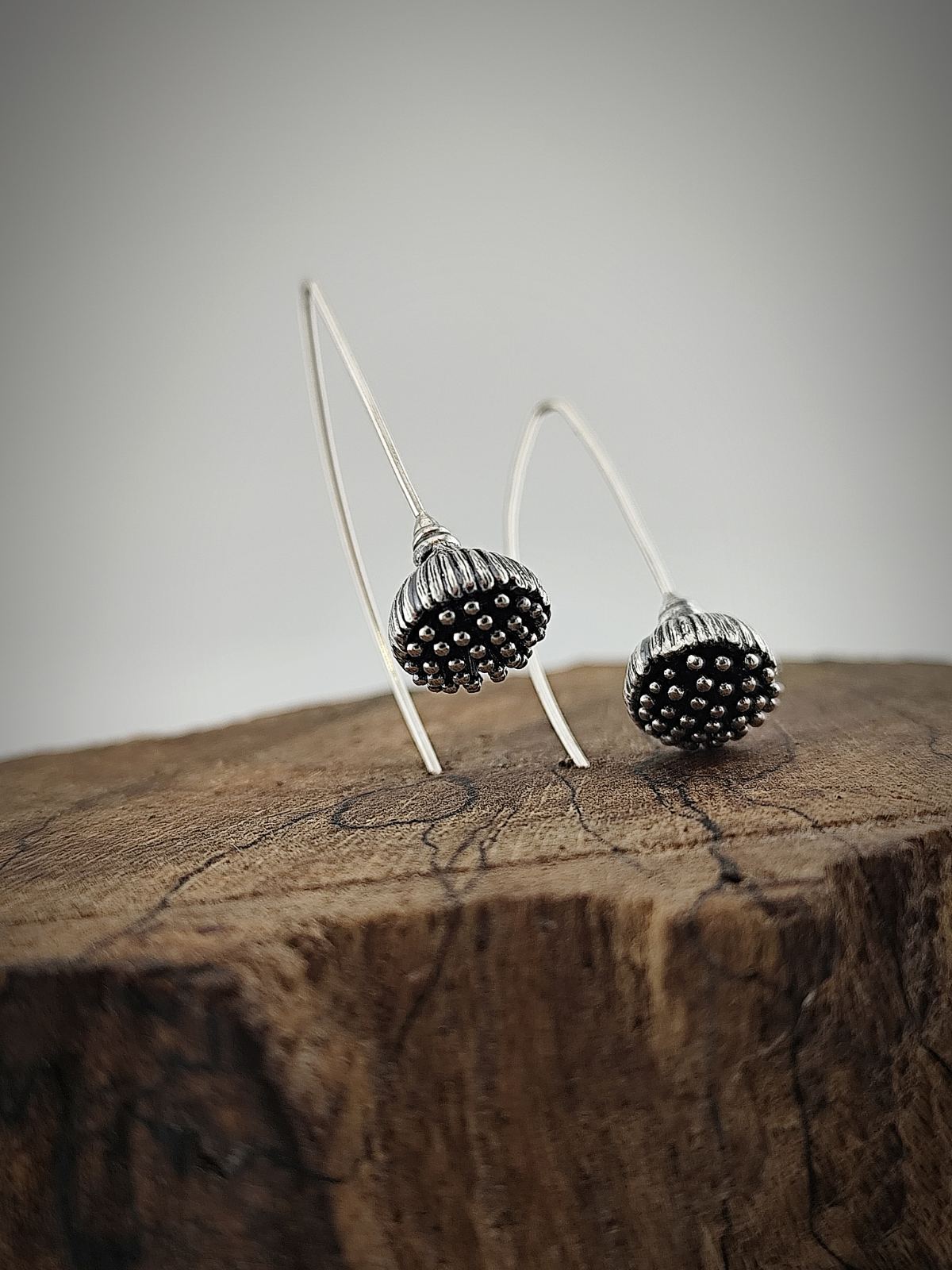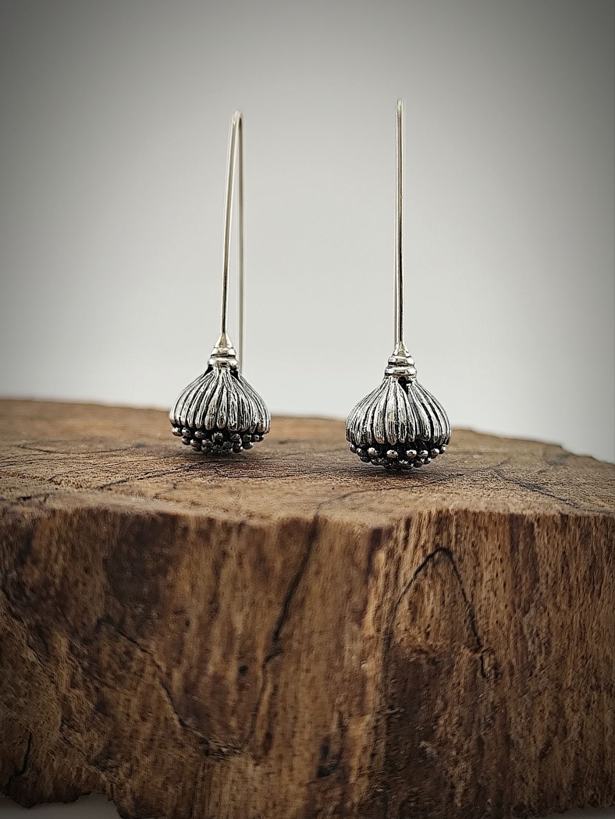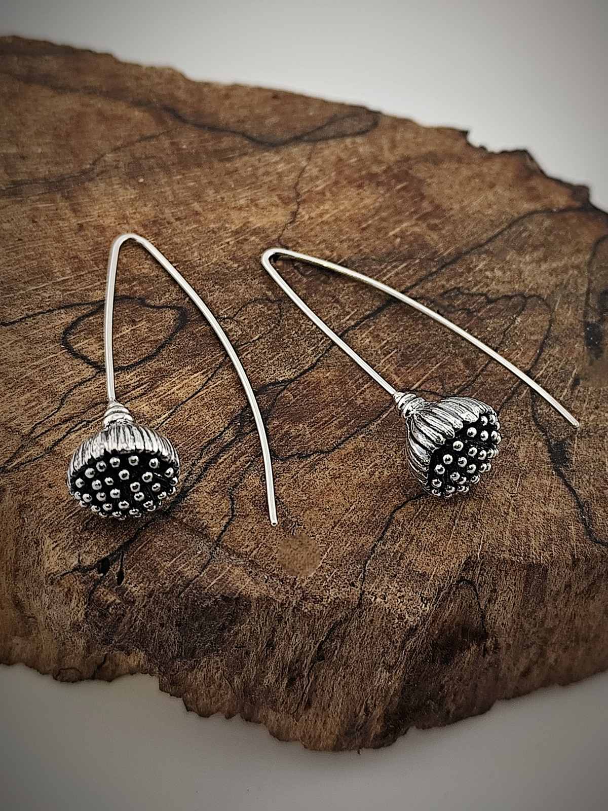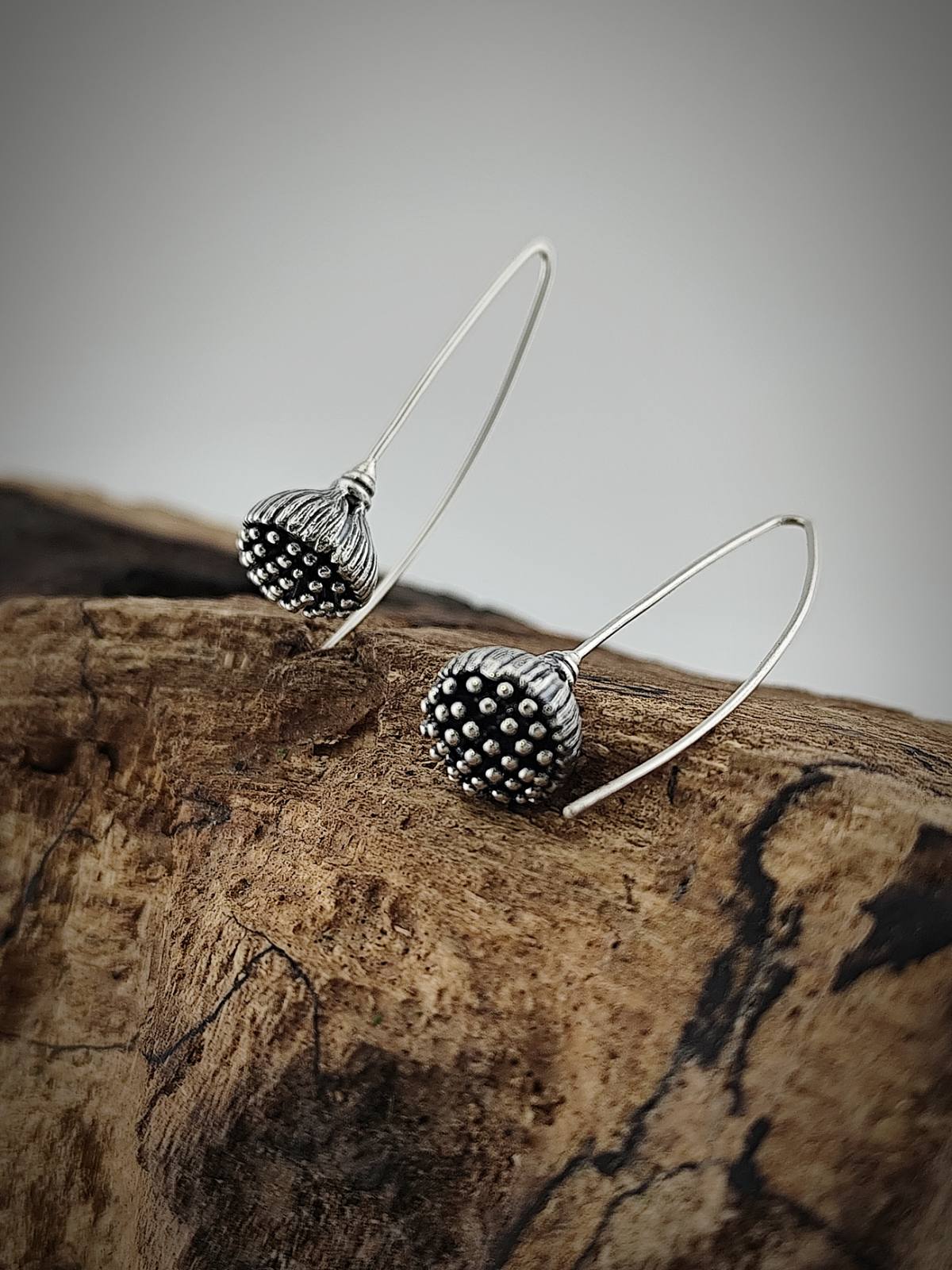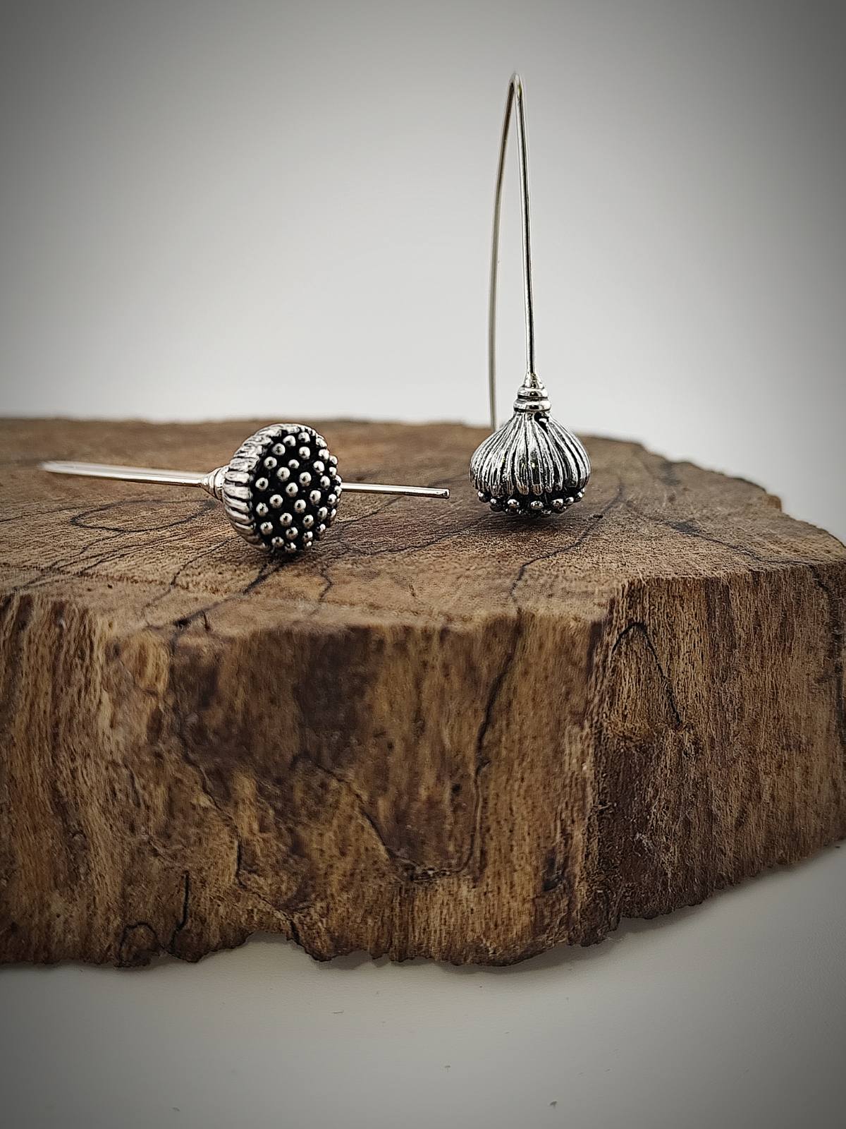 Обеци с издължена закопчалка, която подчертава елегантната линия и осигурява комфорт при носене. Декоративната част е оформена с релефна текстура, напомняща семенната капсула на мак – детайл, който съчетава натурално вдъхновение и изтънчен стил.