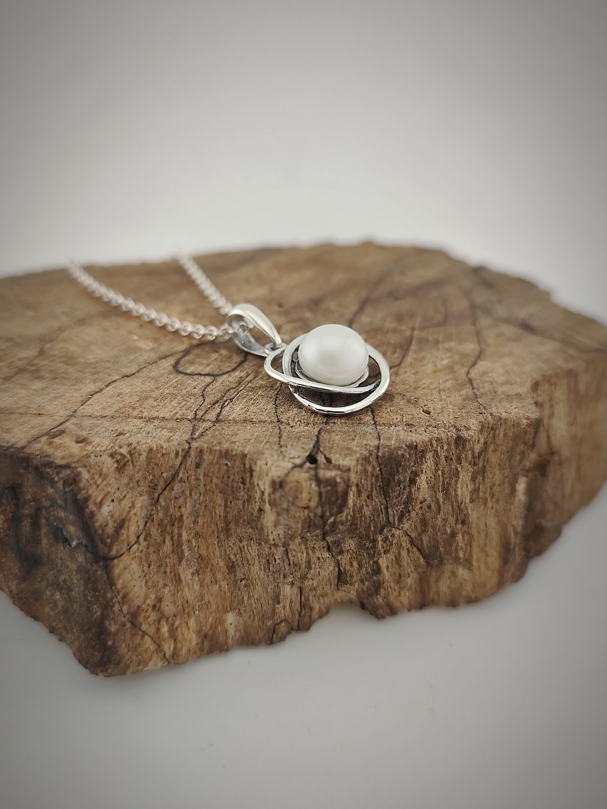 Перлата заема естествено място в центъра на композицията и се превръща в тих акцент, който носи мекота и елегантност. Формата е изчистена и премерена, така че да подчертае красотата на камъка, без излишни детайли.