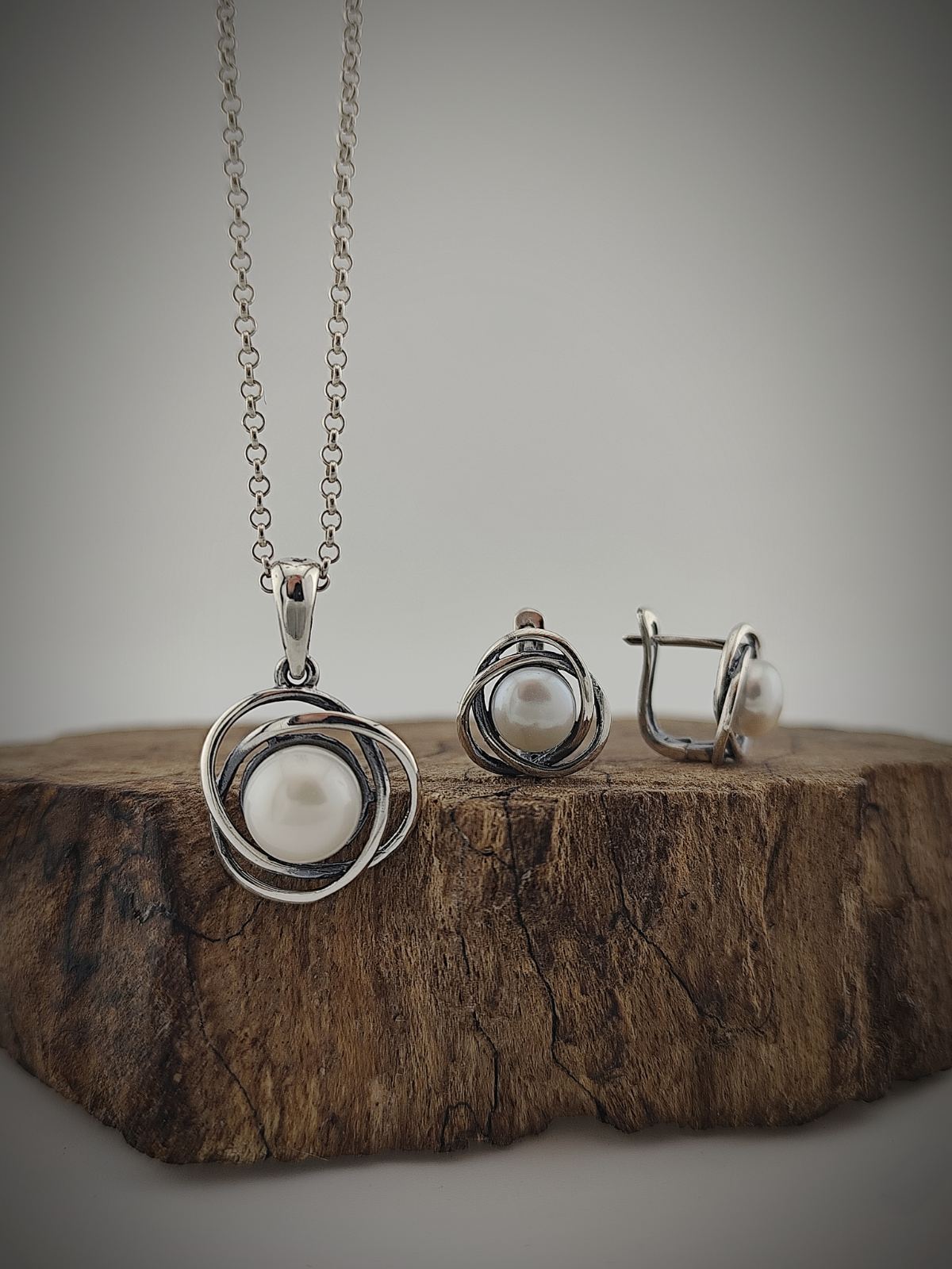 Сребърен комплект с перла „Кръгът“ е вдъхновен от една от най-съвършените форми – кръга. Символ на цялост, хармония и непрекъснатост, той придава на бижуто усещане за завършеност и баланс.