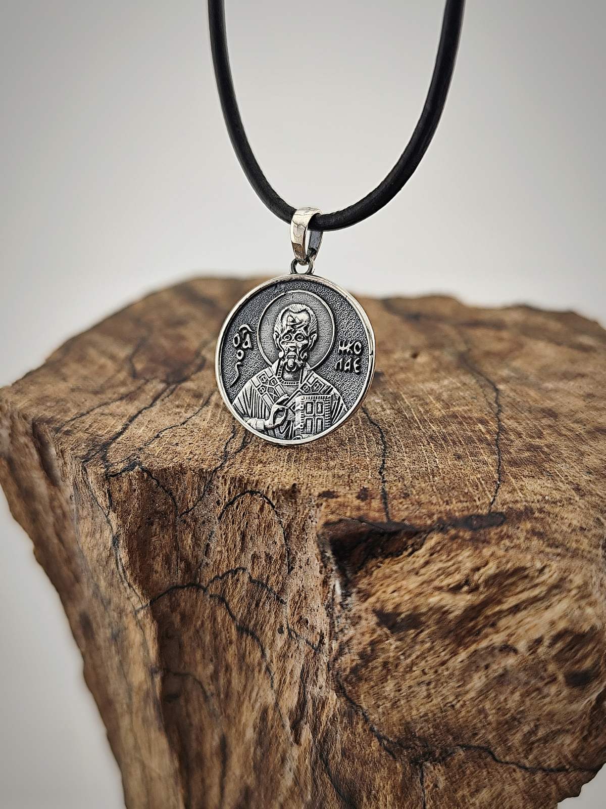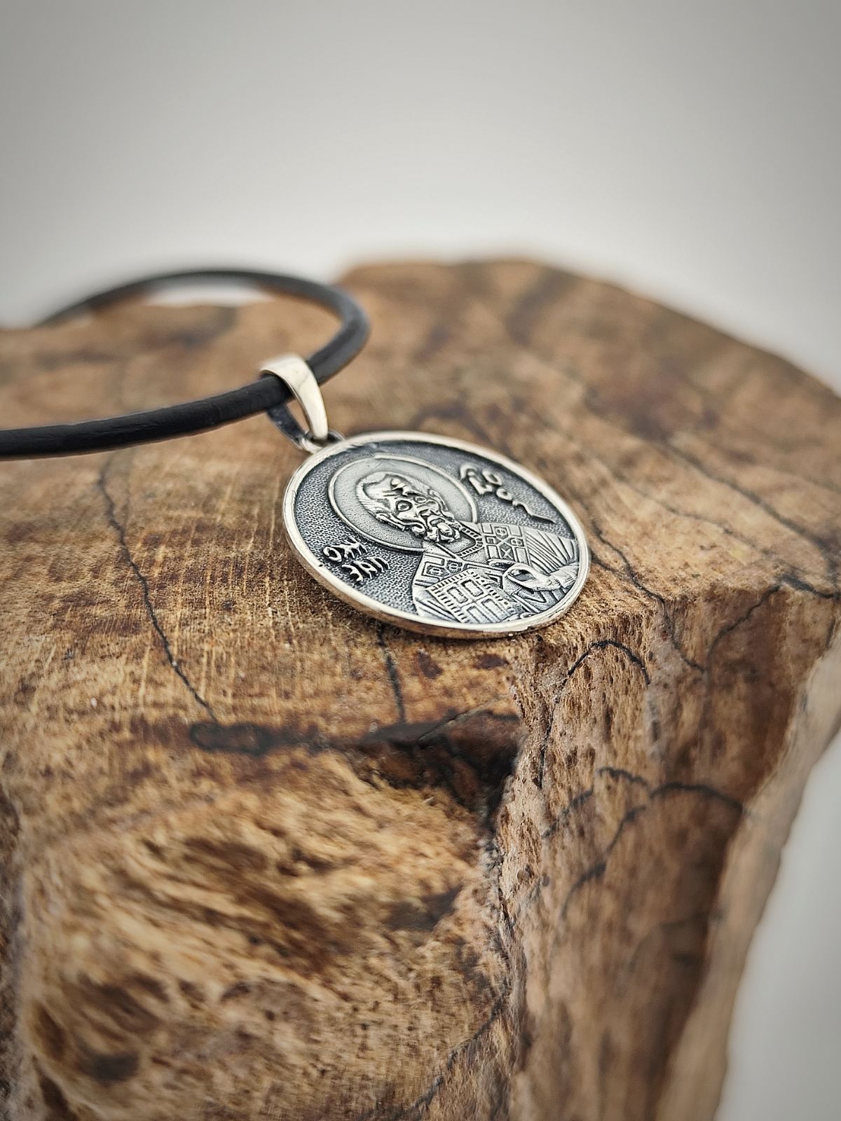 Сребърен медальон „Свети Николай“ – символ на закрила и духовна сила. Ръчно изработен от сребро 925 с изящни детайли, този амулет носи късмет и защита.