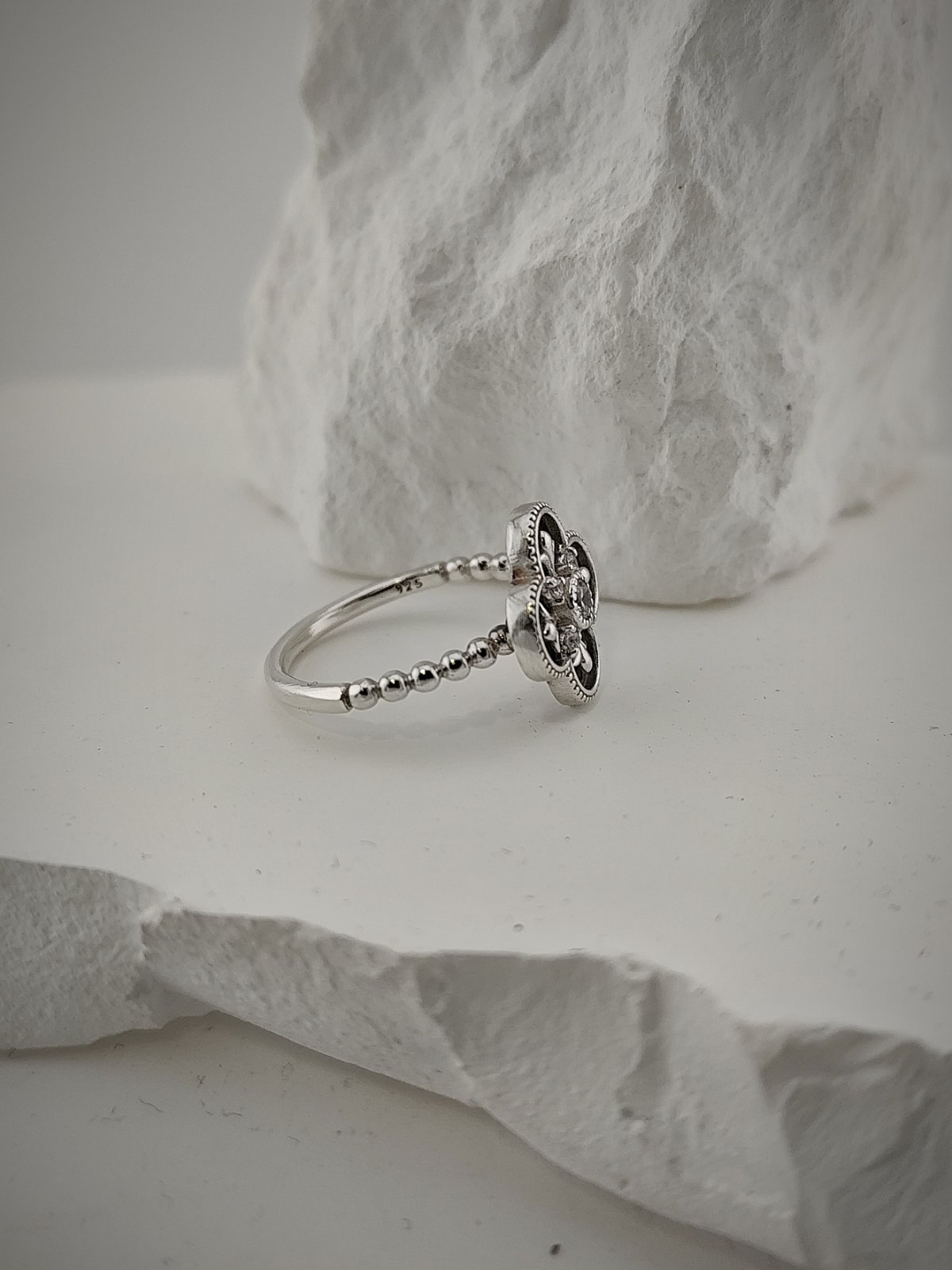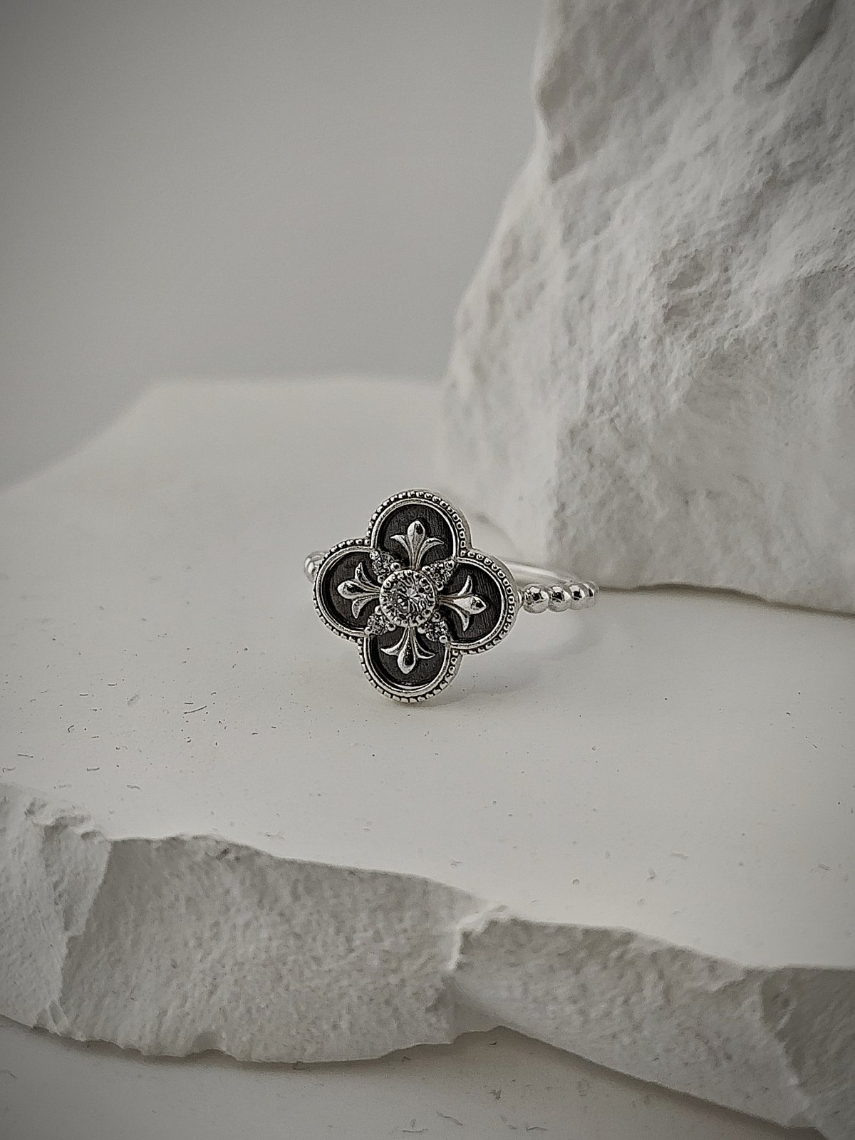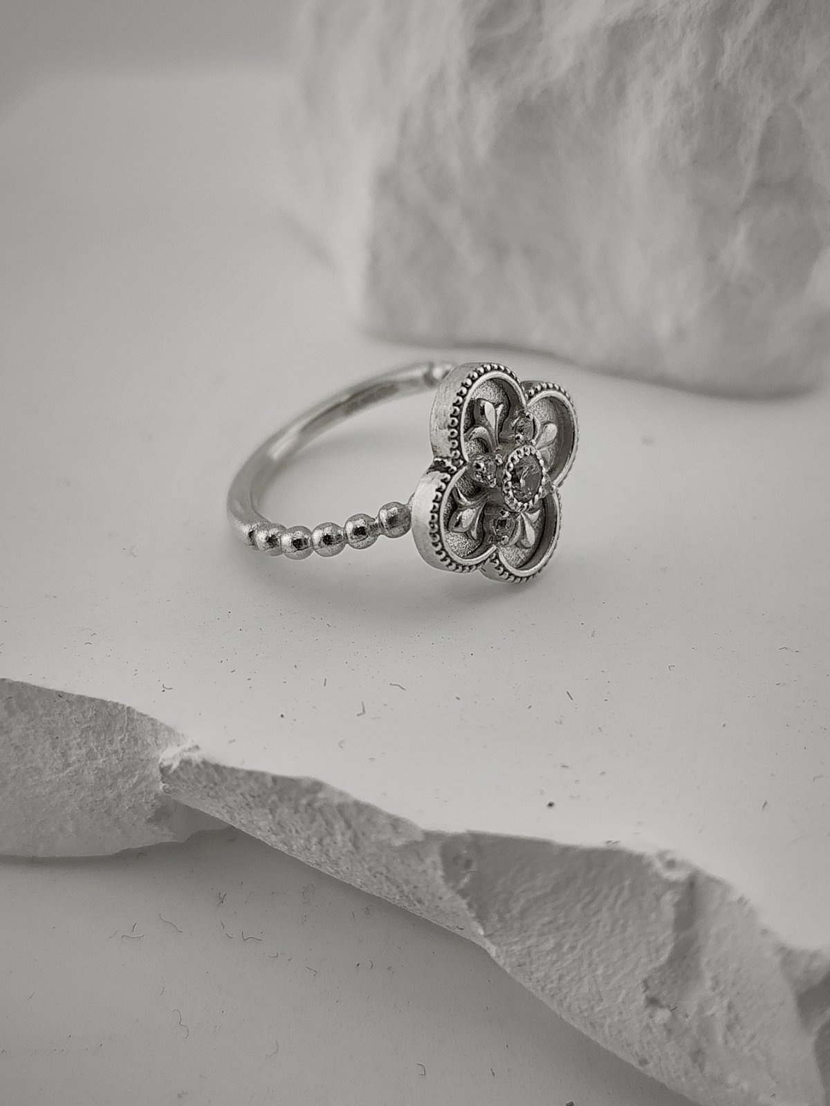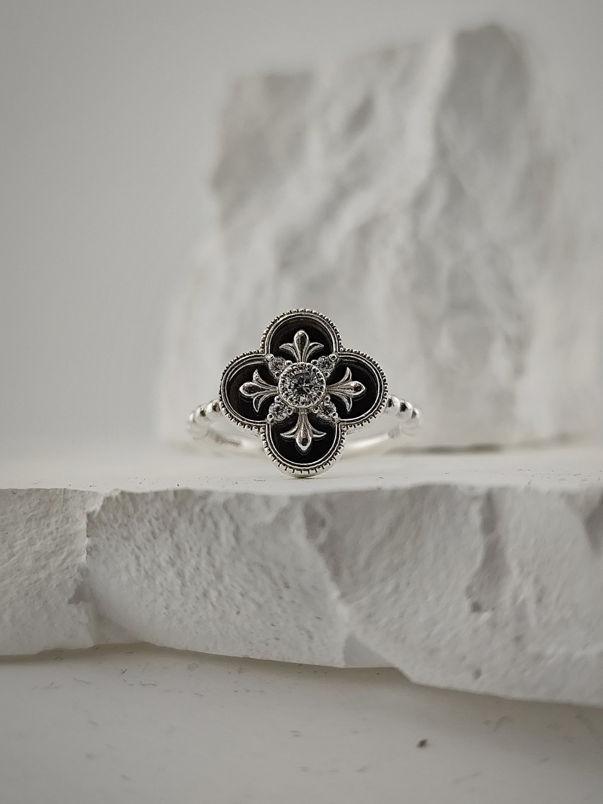 Сребърен пръстен „Elyra“ с централен циркон и четири допълващи камъка. Орнаментален дизайн с прецизна ръчна изработка и възможност за избор между оксидиран или матиран вариант.