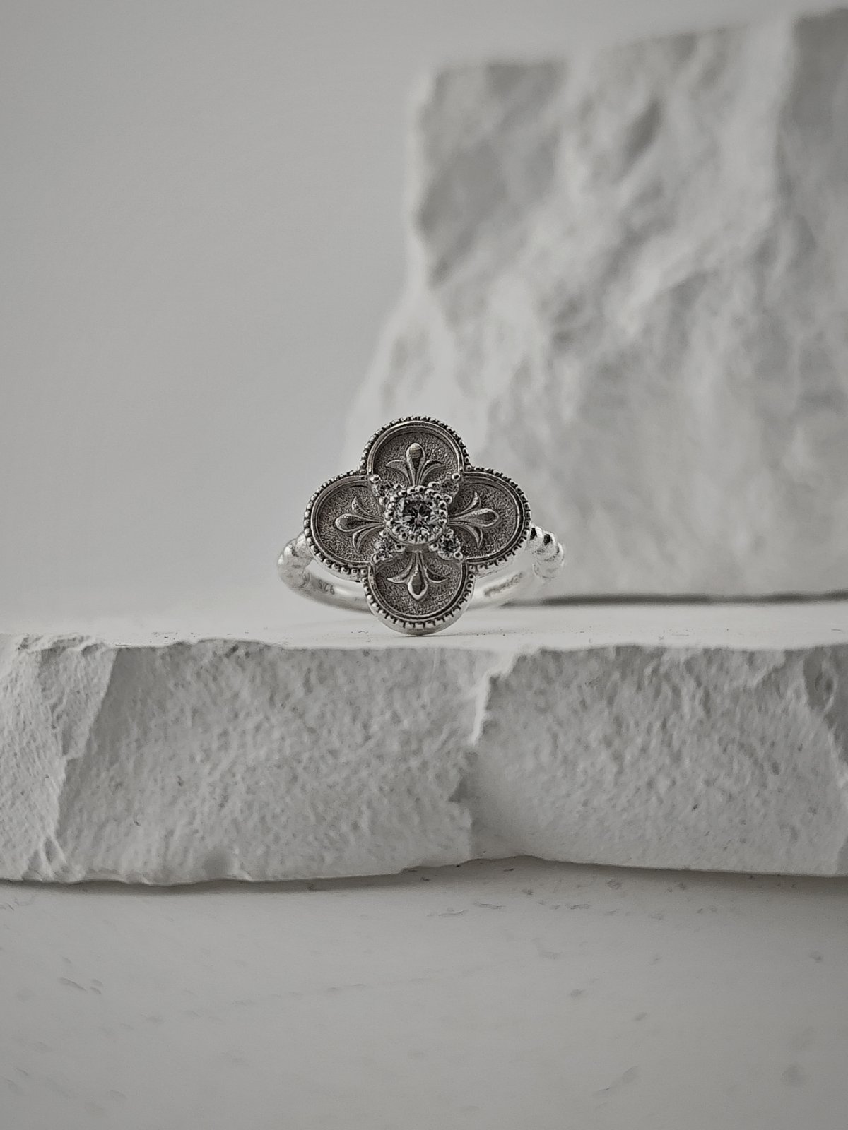 Дизайнът на пръстена „Elyra“ е вдъхновен от класическите орнаменти в бижутерията, където центърът и симетрията са водещи.
