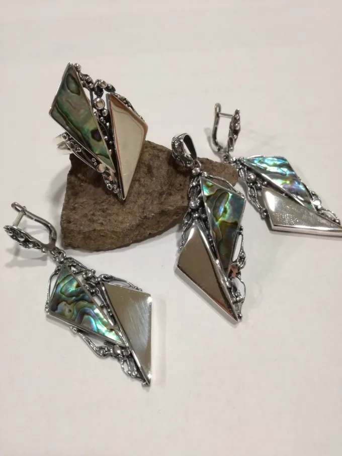 Дамски комплект бижута от сребро с кралски седеф, ръчно изработени авторски пръстен, висулка и обици от Студио Николас!