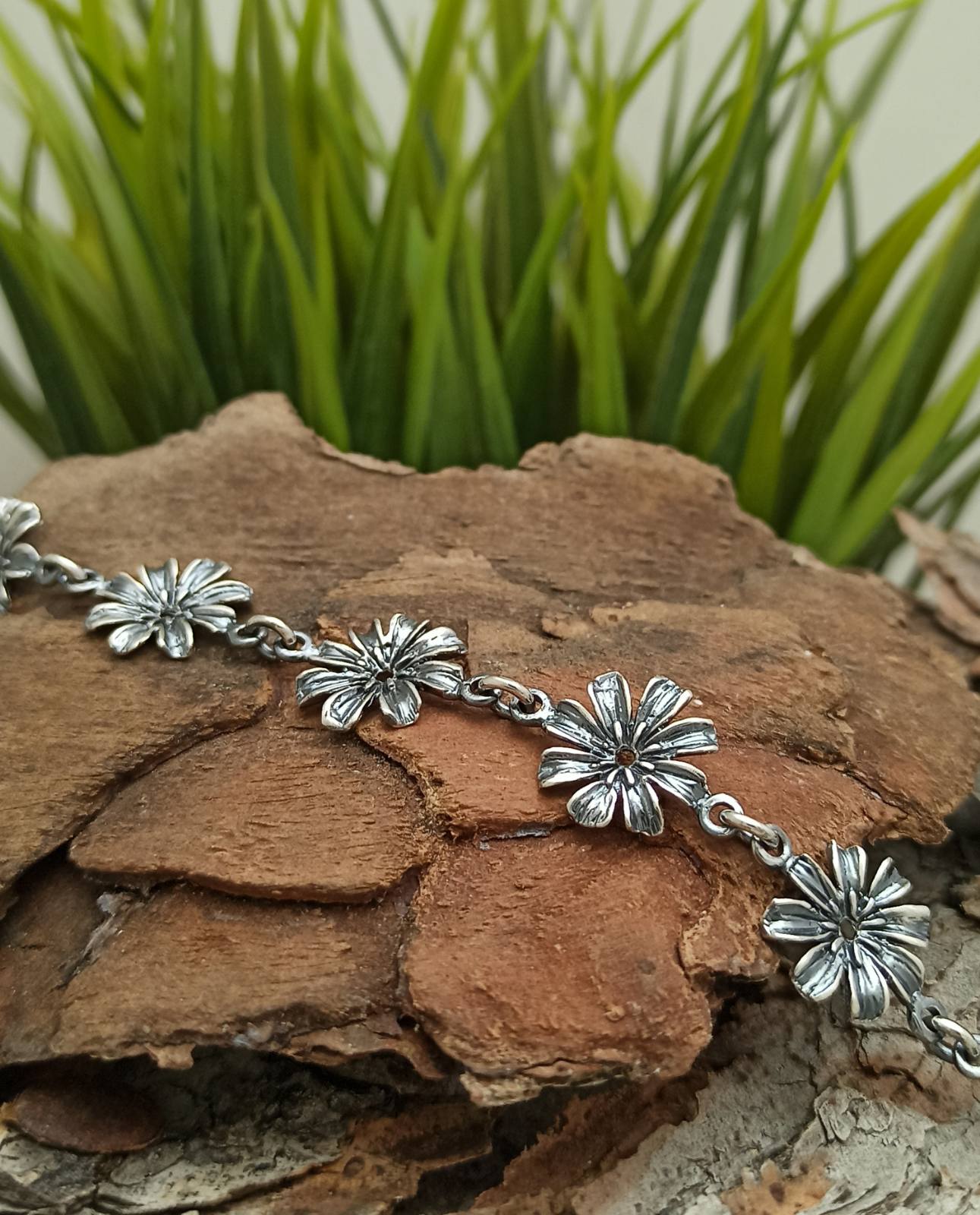 Шоколадовият космос е рядко и невероятно красиво цвете, родом от Мексико. Цъфти в края на лятото и вечер, получавайки името си от аромата на шоколад. Цветът му е наситено червен или кафяв. Цветето символизира красотата, страстта и уникалността. “Красивото за очите, особено ако е и единствено, е скъпо за сърцето… ще се предава от поколение на поколение, като семейна ценност.” Дамска сребърна гривна с цветя, модел 1162B от Студио Николас.