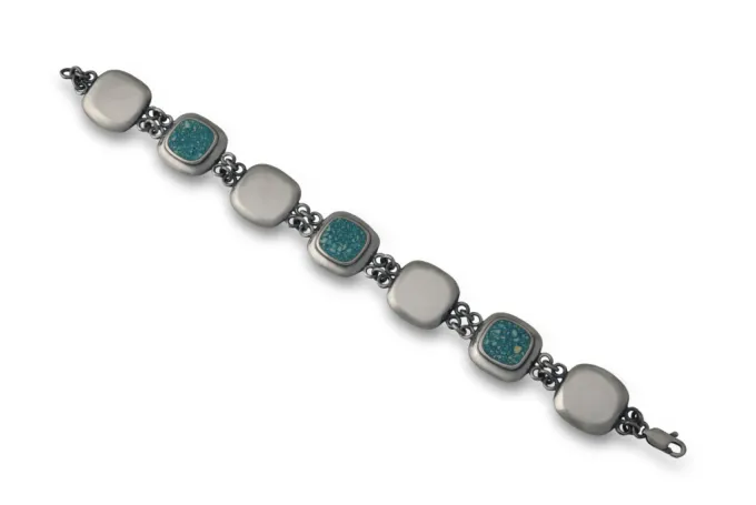 Дамска сребърна гривна инкрустирани с емайл отделни плочици комбинирани с гладко сребро. Модел 632B на Студио Николас, български производител на бижута за мъже и жени: синджири, пръстени, медальони, гривни и обеци. Sterling silver 925.