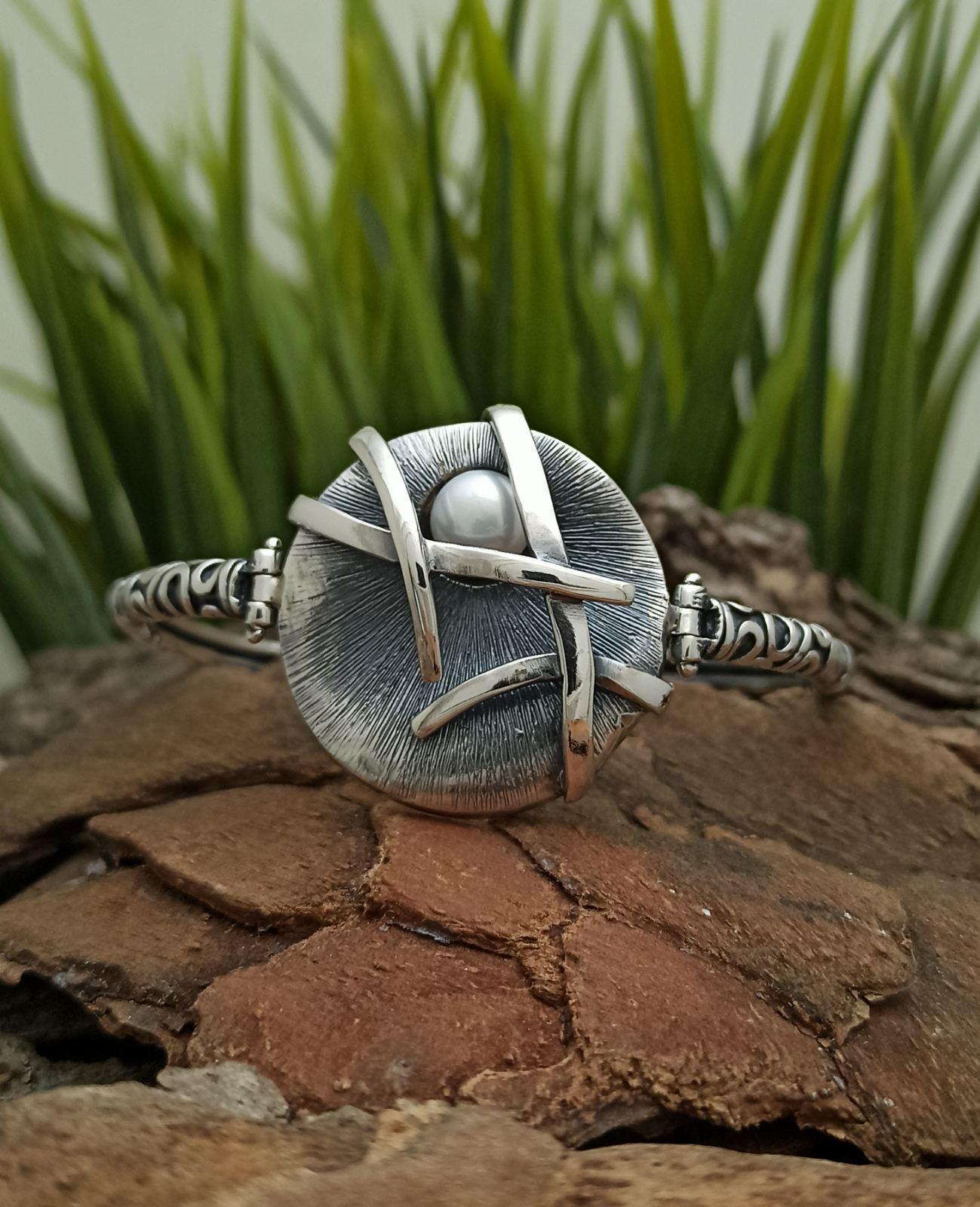 Дамска сребърна гривна с перла 1134B. С очарователна визия –  кръг оплетен със сребърни ленти и лепена речна перла. Студио Николас е фабрика за производство на сребърни бижута със сертификат за гаранция и качество!