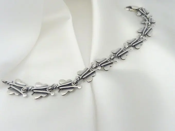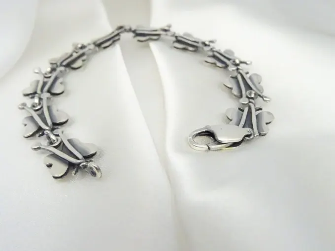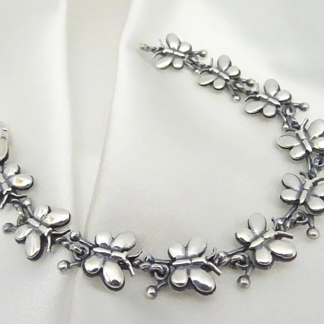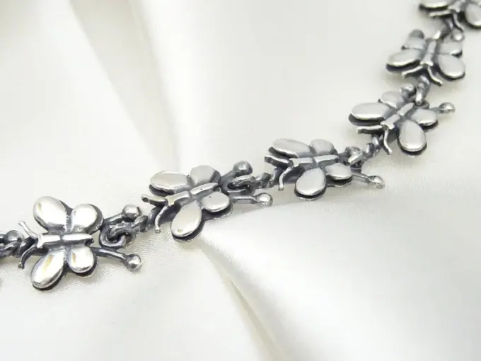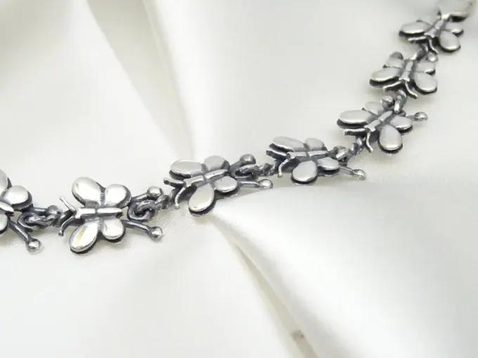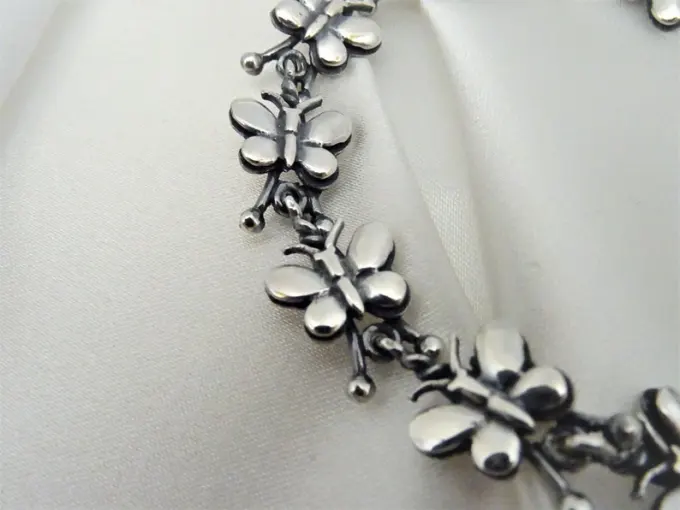 Сребърна гривна “ПЕПЕРУДА”, съставена от отделни подвижни елементи – малки пеперуди, арт модел гривна от сребро. Фабрика за сребърна бижутерия от България – Студио Николас! Nikol@s е изкуството, с внимание към всеки детайл.Ръчна изработка, 925 проба, сребърна красота!