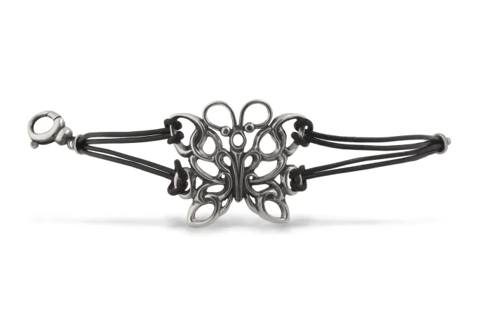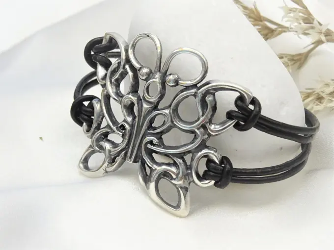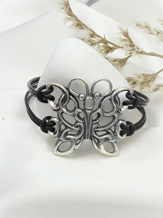Гривна с кожа “Сребърна ПЕПЕРУДА”- Нежни орнаменти във формата на пеперуда с кожена каишка и закопчалка от сребро.