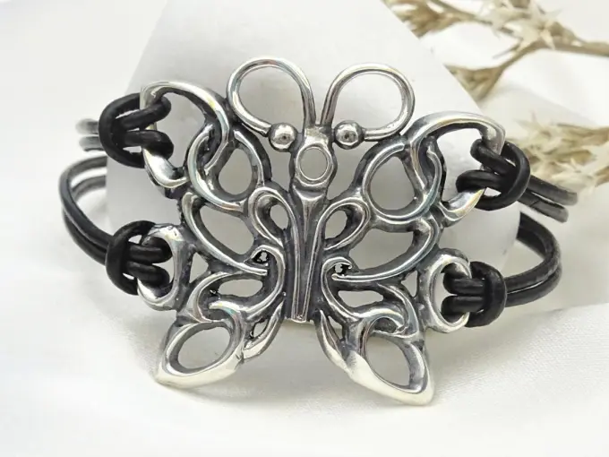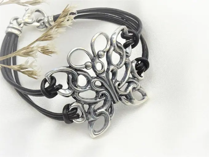 Сребърна гривна “ПЕПЕРУДА”- Нежни орнаменти във формата на пеперуда с кожена каишка и закопчалка от сребро.Nikol@s е изкуството, с внимание към всеки детайл. Ръчна изработка, 925 проба, сребърна красота!