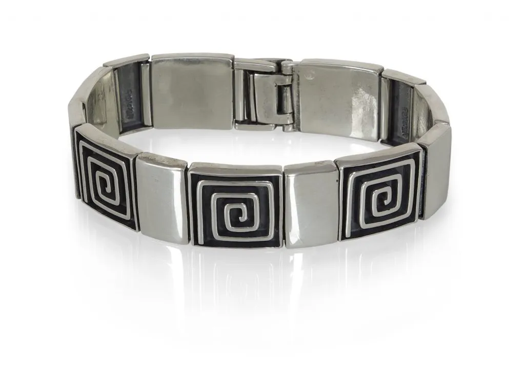 Дамска сребърна гривна 441B. Модел “СПИРАЛА” има каталожен номер 441B на Студио Николас. Създадена от сребро с проба 925, гривната има отделни правоъгълни елементи и квадрати спирала. “СПИРАЛА-та” е символ на живот и енергия, свързван също с изобилие и успех !