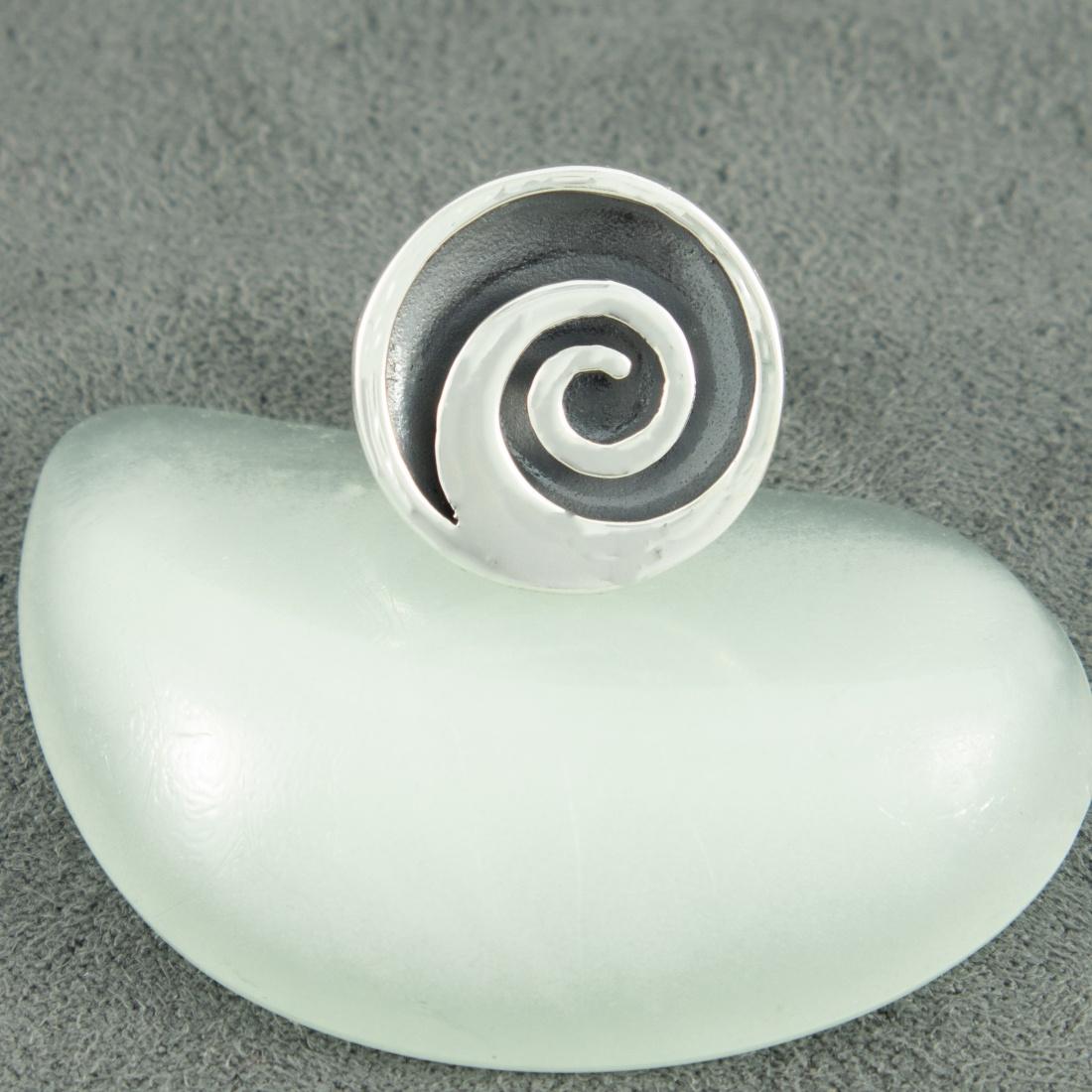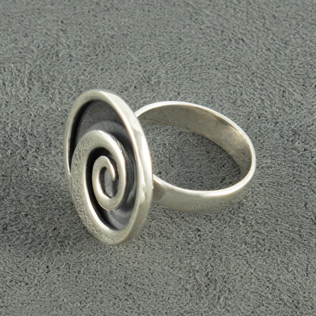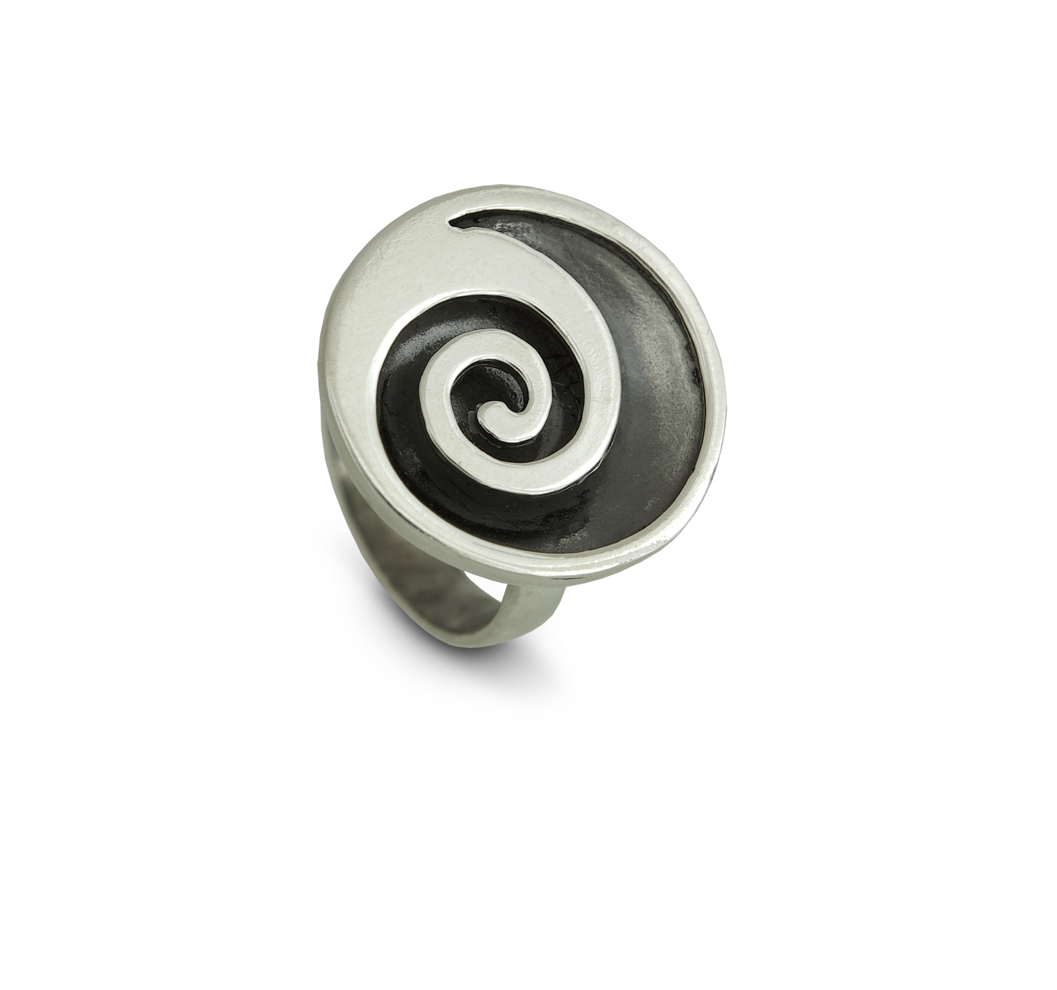 Дамски сребърен пръстен с кръгла плочка и закачлива завъртулка от сребро напомняща на символ ИН-ЯН. Модел 485R от Студио Николас. Nikol@s е изкуствoто, с внимание към всеки детайл. Красиви стилни масивни дизайнерски сребърни пръстени за жени от производител на накити Студио Николас.Сребърни бижута с ръчна изработка, 925 пробa, сребърна красота!Дамски сребърен пръстен “Спирала” 485R.
