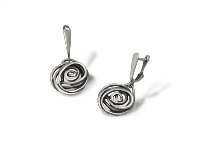 Дамски сребърни обеци модел 604E с кръгла плочка съставена от навита сребърна тел Студио Николас. Ръчна изработка, 925 проба, сребърна красота – бижута от сребро за жени!