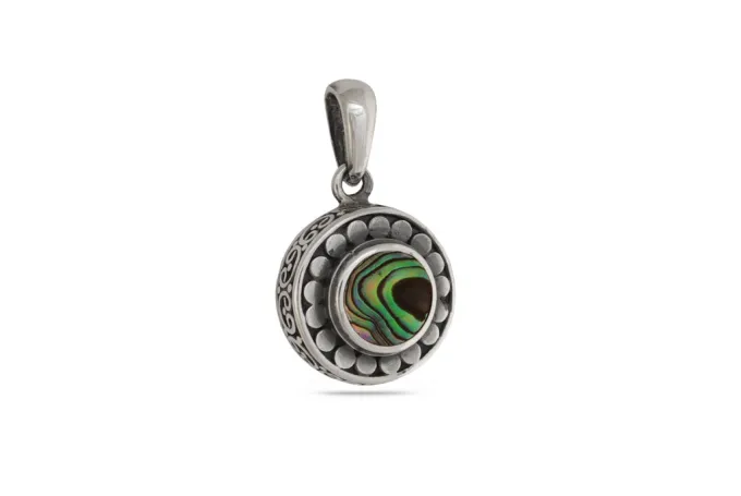 Дамски сребърен медальон със седеф. Модел в кръгла форма със сърцевина от кралски седеф и рамка от гравирано сребро с проба 925. Прецизно и ръчно изработен от ювелирите на фабрика за сребърна бижутерия – Студио Николас!