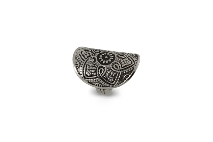 Мандала е геометричен дизайн, който представлява вселената в индуизма и будизма. Отличава със сложни, симетрични дизайни, коѝто се излъчват от централна точка. Мандалите се използват като духовен и ритуален символ в тези религии и често се спомагат за медитация, лечение и други практики. Действия насочени към постигане на чувство за вътрешна хармония и баланс. Мандалите могат да бъдат намерени и в други култури и често се използват за арт терапия, намаляване на стреса и релаксация. Дамски сребърен пръстен “МАНДАЛА”