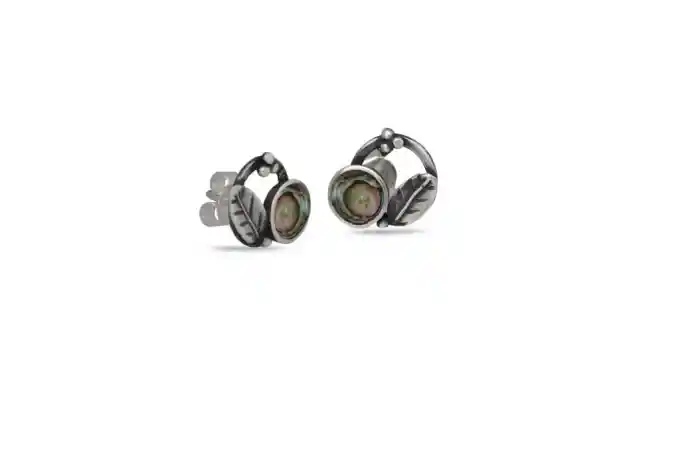 Сребърни обеци в кръгла форма с елемент на листо. Изработени с цветен седеф, черен или бял емайл, окачването е тип щифт. Проба на среброто 925 Ag.