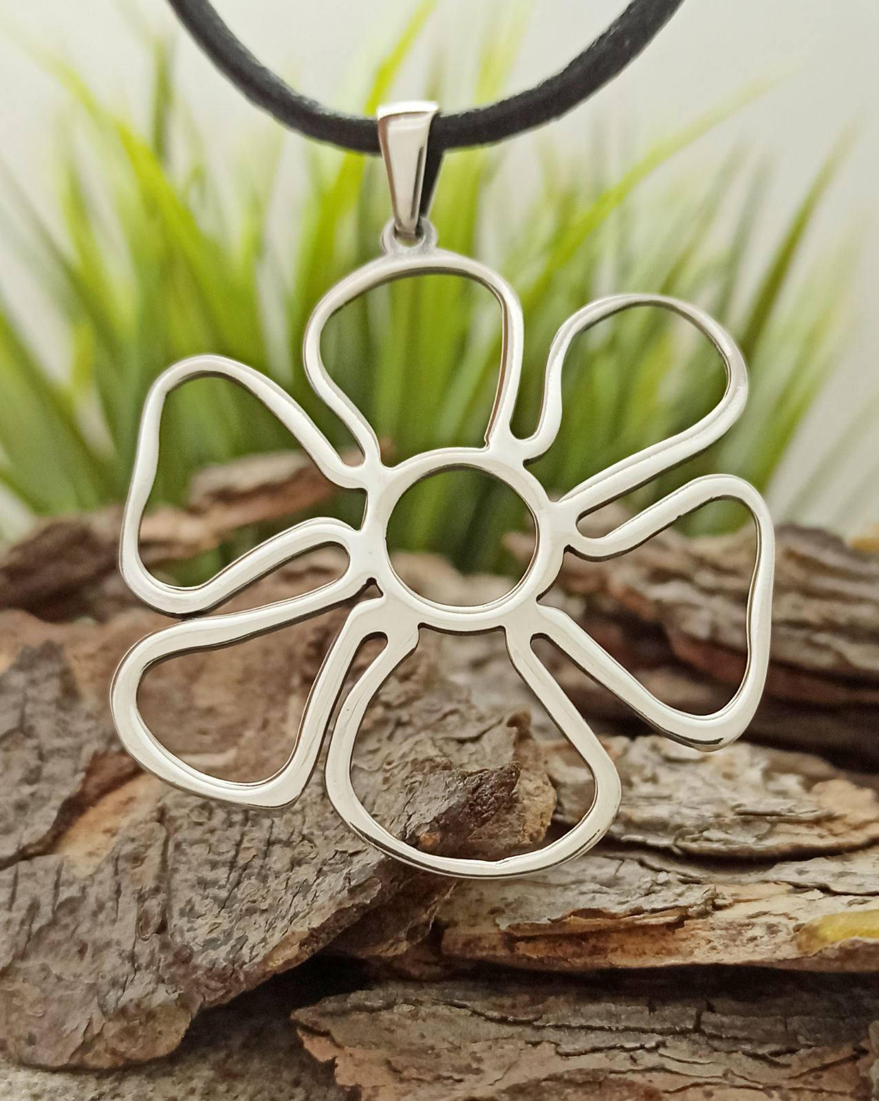 Дамски сребърен медальон във формата на цвете, подходящ за поставяне на кожена верижка или силикон. Авторски модел 980m висулка от сребро на Студио Николас .