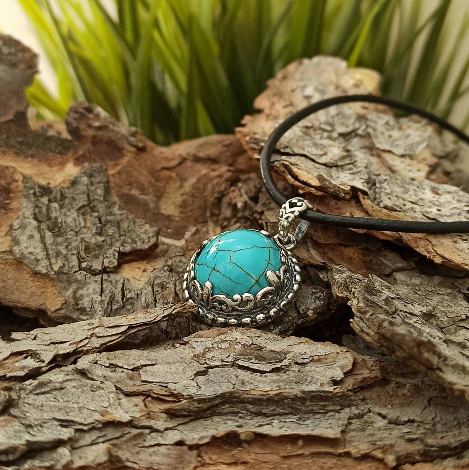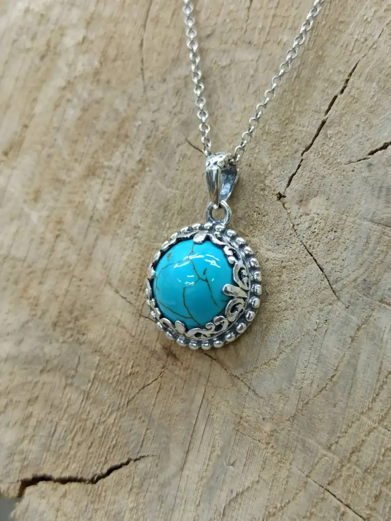 Тюркоазът (тюркизът) е фосфатен минерал /CuAl6(OH)2[PO4]·4H2O/, полускъпоценен камък. В Древен Египет се е добивал от Синайския полуостров. В буквален превод тюркоаз означава „турски камък“. Това име е дадено поради това, че е внасян в Европа през Турция от Персия, където са били експлоатирани негови находища. Цветът на камъка варира в разнообразни нюанси: жълт, зелен, син и други цветове, които се доближават до синьото.Сребърен медальон с тюркоаз 1247MT.
