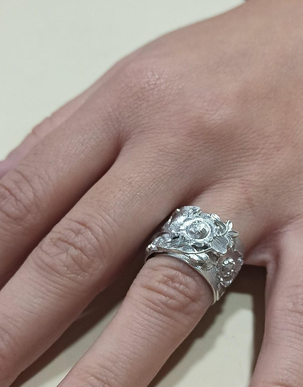 Дамски сребърен пръстен “Божури”  – релефна лента декорирана с цветя, детайлно и деликатно изваян  аксесоар от нежно сребро с проба 925. Пръстенът е “отворен” модел и ще можете да го регулирате внимателно по размер, по-свободен или по-стегнат. Удобен е да се използва на предпочитан от вас пръст или като пръстен за палец. Тъй като някои цветя означават приятелство, а други символизират любов, това бижу  може да бъде подарък за любим човек или за най-добър приятел…Фабрика за производство на сребърна бижутерия за жени – Студио Николас.