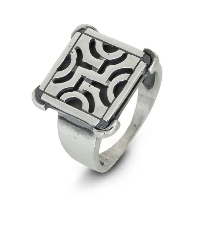 Пръстен 463R с уникален дизайн, който несъмнено заинтригува. Представяме Ви символът на единство и цялост видян през погледа на Студио Николас. От рисунката до полирането вашето бижу е ръчно изработено с гарантирано съдържание на сребро в материала.