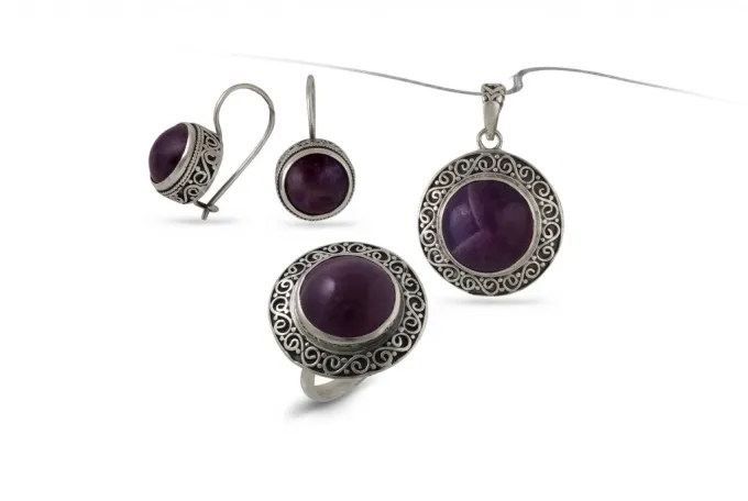 Сребърен пръстен с аметист „Окото на Назар“. „Окото на Назар“ е символ, който се използва като талисман или амулет за предпазване от зло и негативни енергии. Той има произход от стародревната персийска култура и се свързва с вярването във влиянието на злото око., което може да причини болести, нещастия и неуспехи.