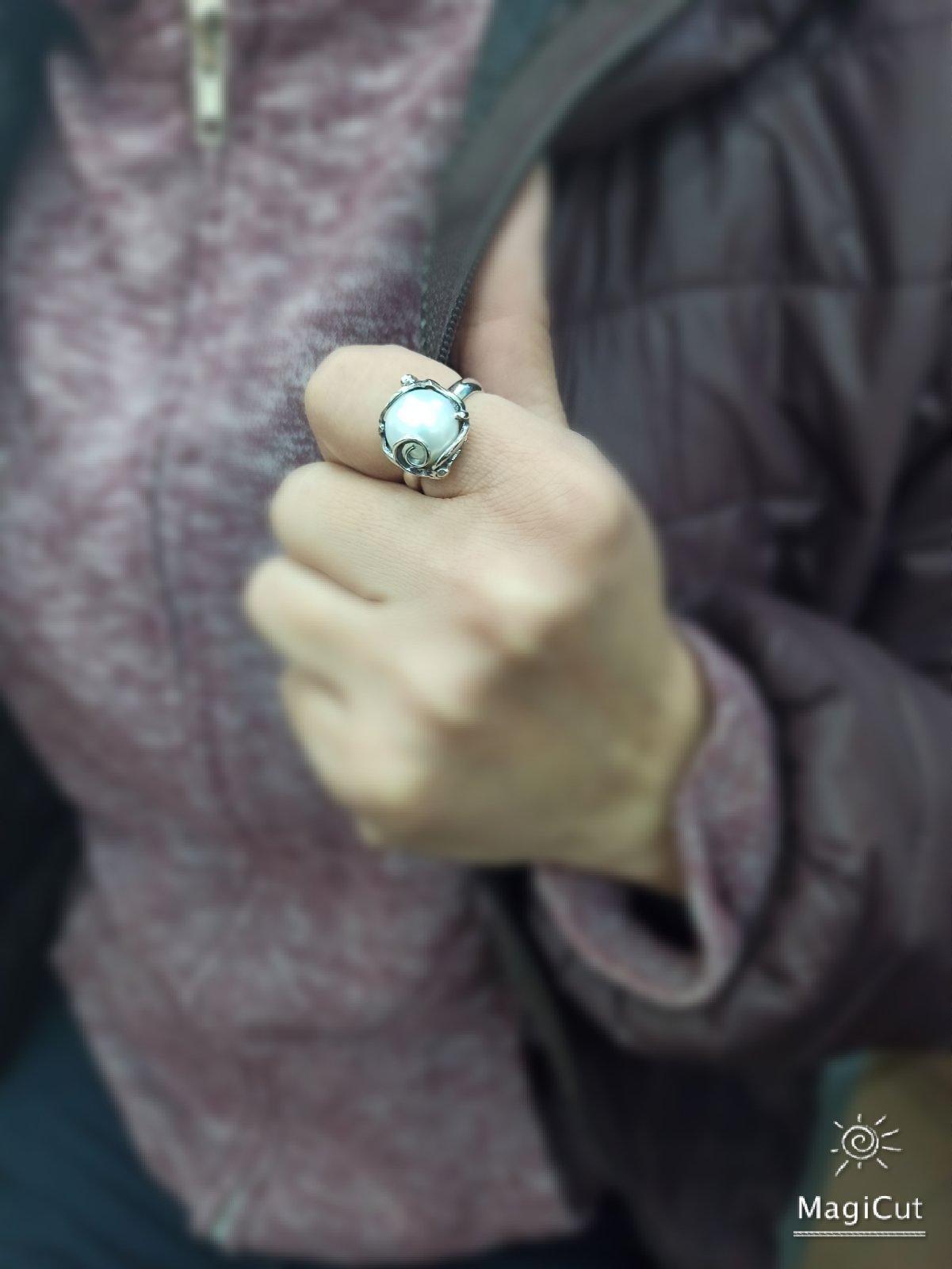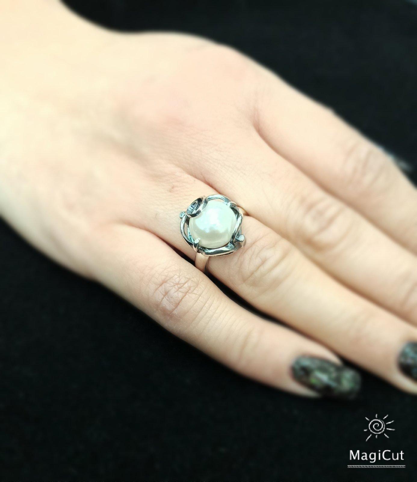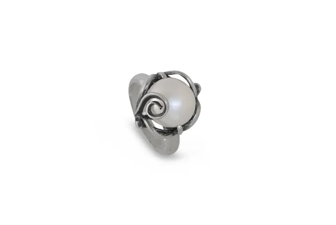 Дамски сребърен пръстен във формата на стилизирано цвете, което е инкрустирано с речна перла. Модел 1119R на Студио Николас, български производител на сребърна бижутерия за мъже и жени.