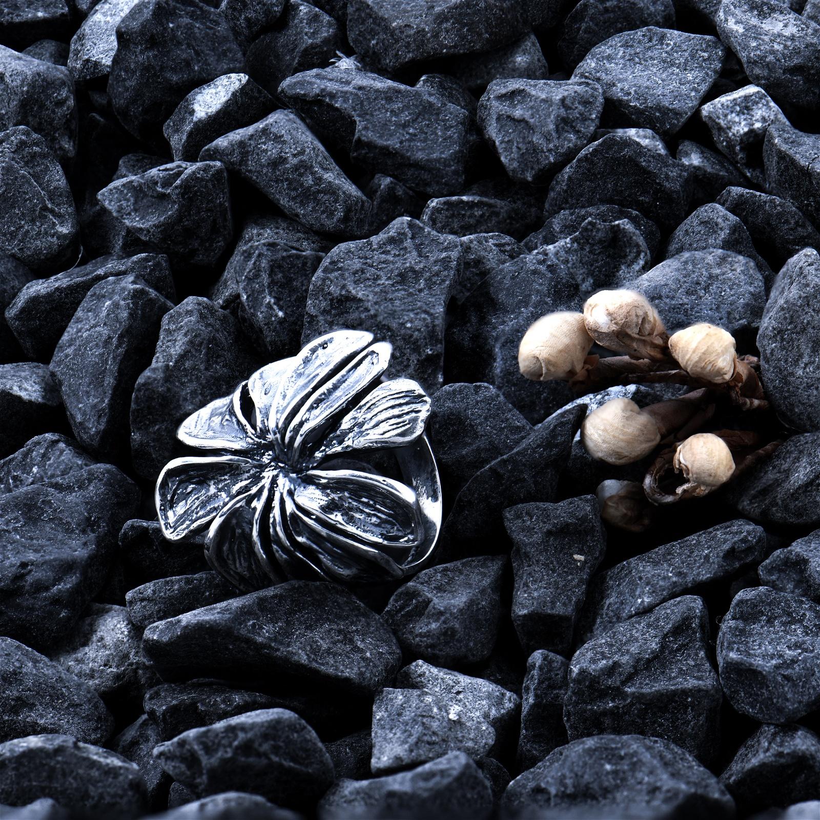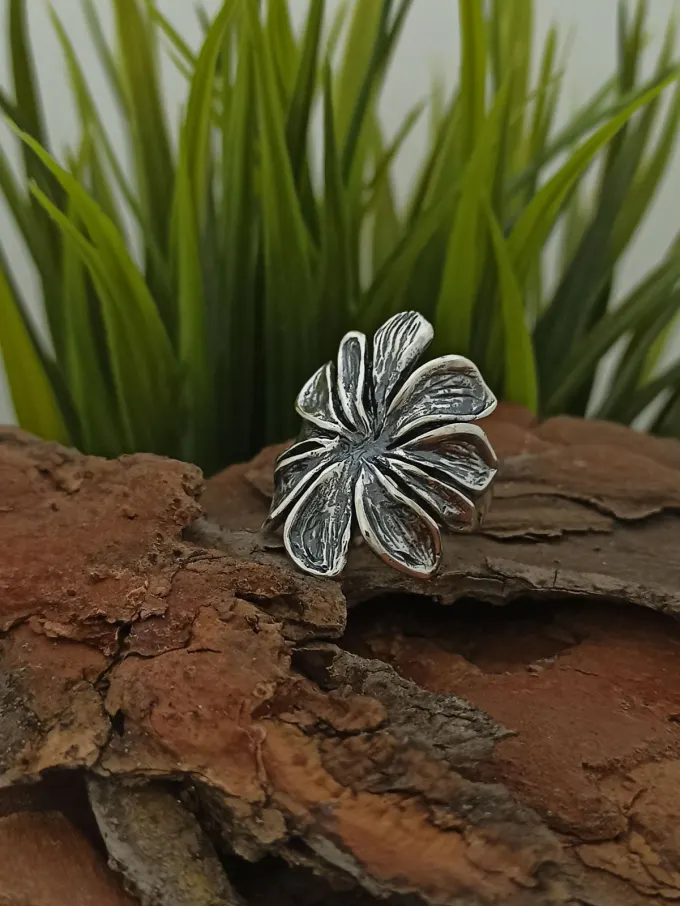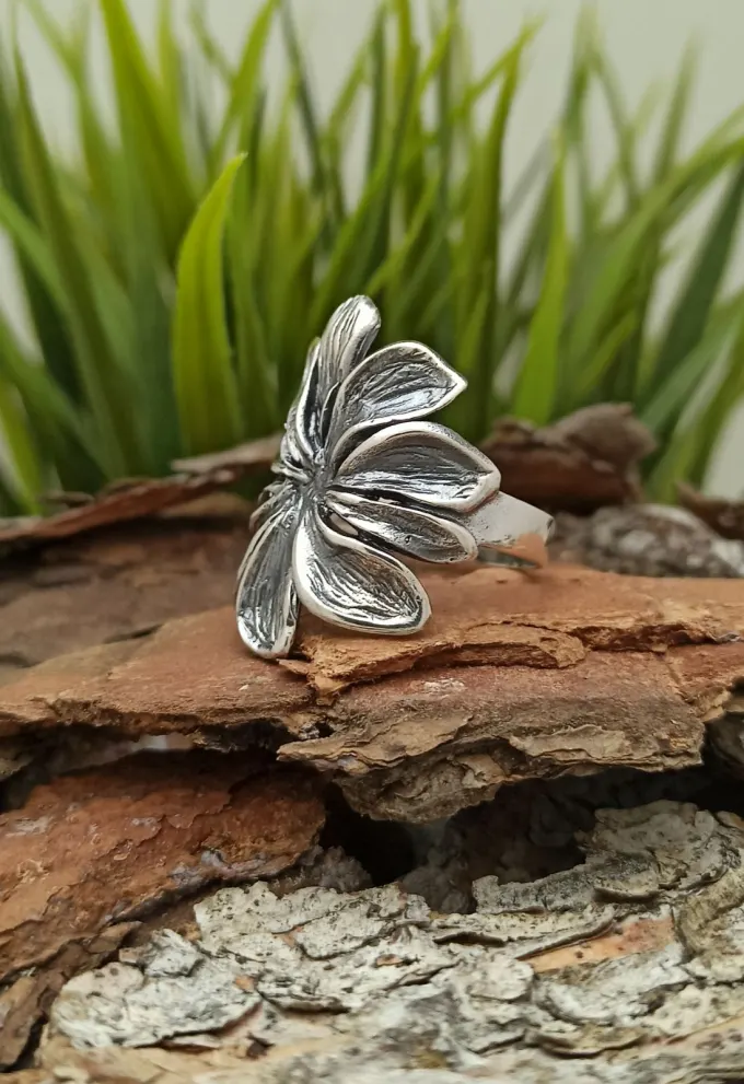 Цветето е изработено с богати, обемни венчелистчета, чиито линии са подчертави чрез оксидация. Това придава на модела характерна дълбочина и контраст, който откроява всяка извивка. Широката форма на пръстена му придава впечатляващо присъствие върху ръката, превръщайки го в централна точка на визията. Същевременно конструкцията е балансирана и удобна за носене в ежедневието.