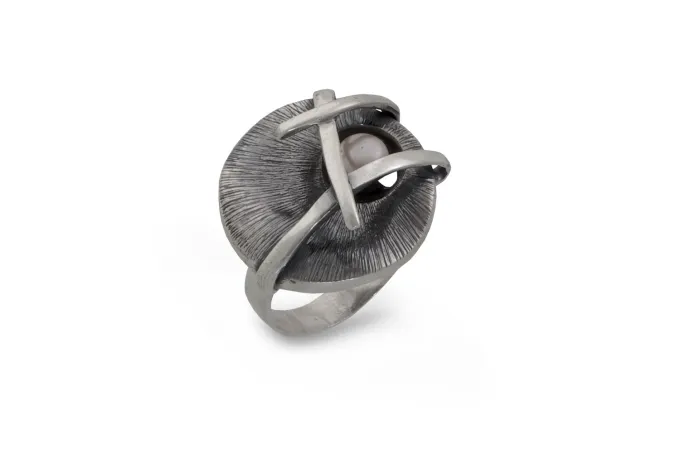 Дамски сребърен пръстен с речна перла модел 890R на Студио Николас. С очарователна визия – на кръг оплетен със сребърни ленти и бяла речна перла.