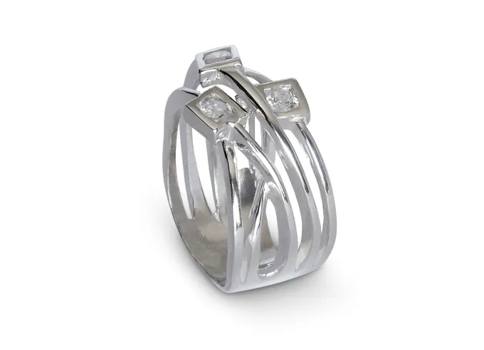 Дамски сребърен пръстен с циркони – изчистен авторски модел 225R на Студио Николас, стилни и модерни пръстени от сребро 925 с циркон.