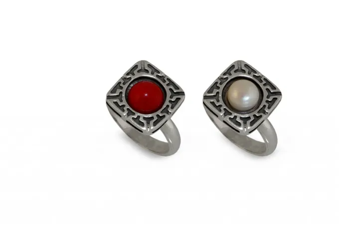 Дамски сребърен пръстен “ТЕТИДА” бижу в квадратна форма с гравюри и инкрустирана речна перла, ръчна изработка от Студио Николас!