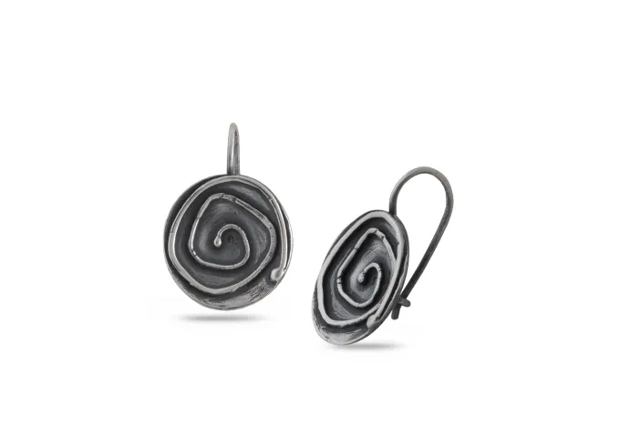 Сребърни обеци с кръгла форма и спирала закопчаването е тип руска кука/ върбило. Модел 853E на Студио Николас. Приблизителното тегло е 6 грама/ размери: 30х19 мм.