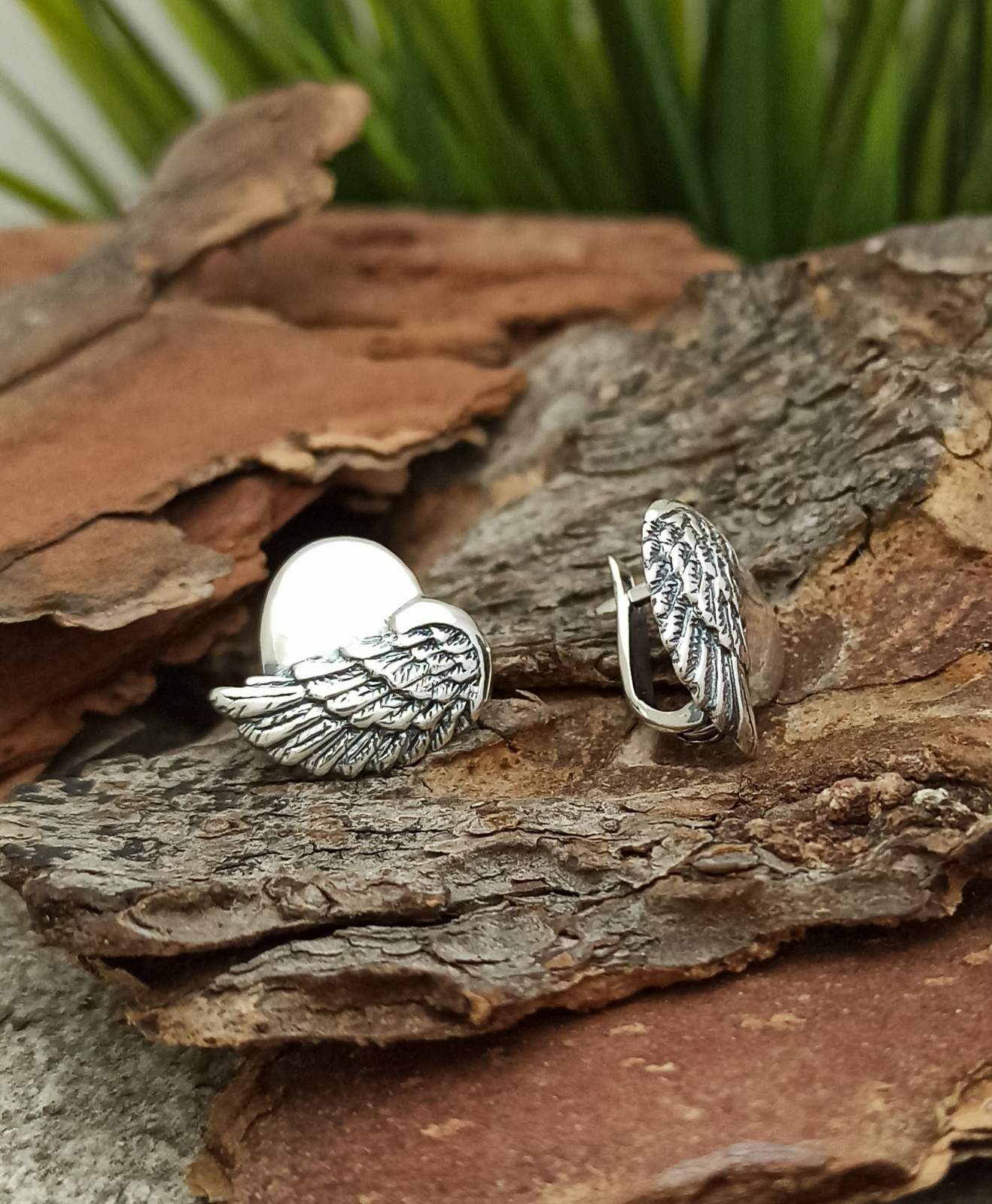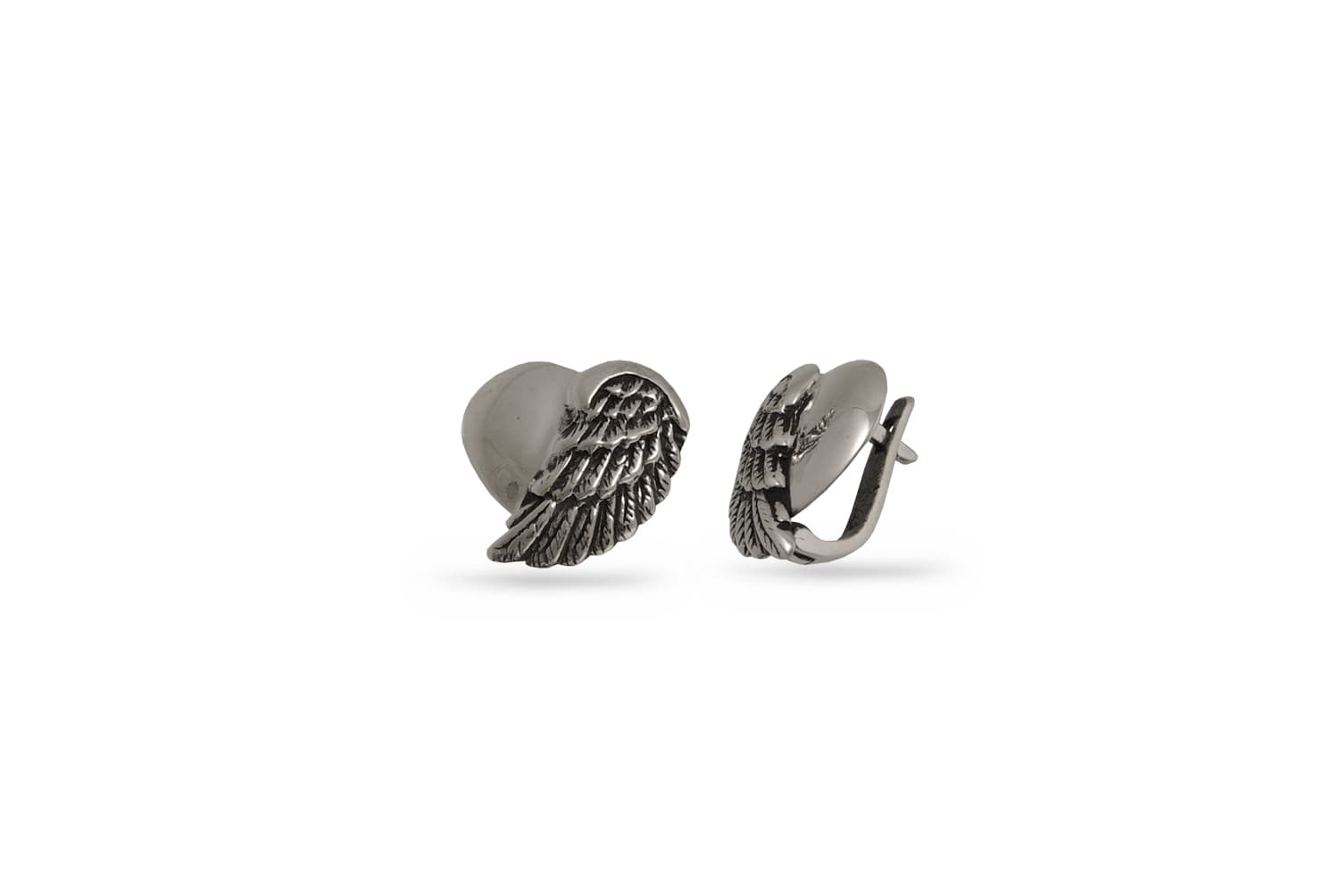 ДАМСКИ СРЕБЪРНИ ОБЕЦИ “Крила на Ангел”, модел 9AN на Студио Николас. Сребърни обеци “Крила на Ангел” са част от серията АНГЕЛ ПАЗИТЕЛ. Ръчно изработени обици на скрито английско закопчаване във форма на сърце с пера. Перата се използват за направата на различни магически атрибути, амулети срещу зли очи и  амулети за привличане на късмет.дължина на обеците: 1.50 см./приблизително тегло: 3.10 гр.