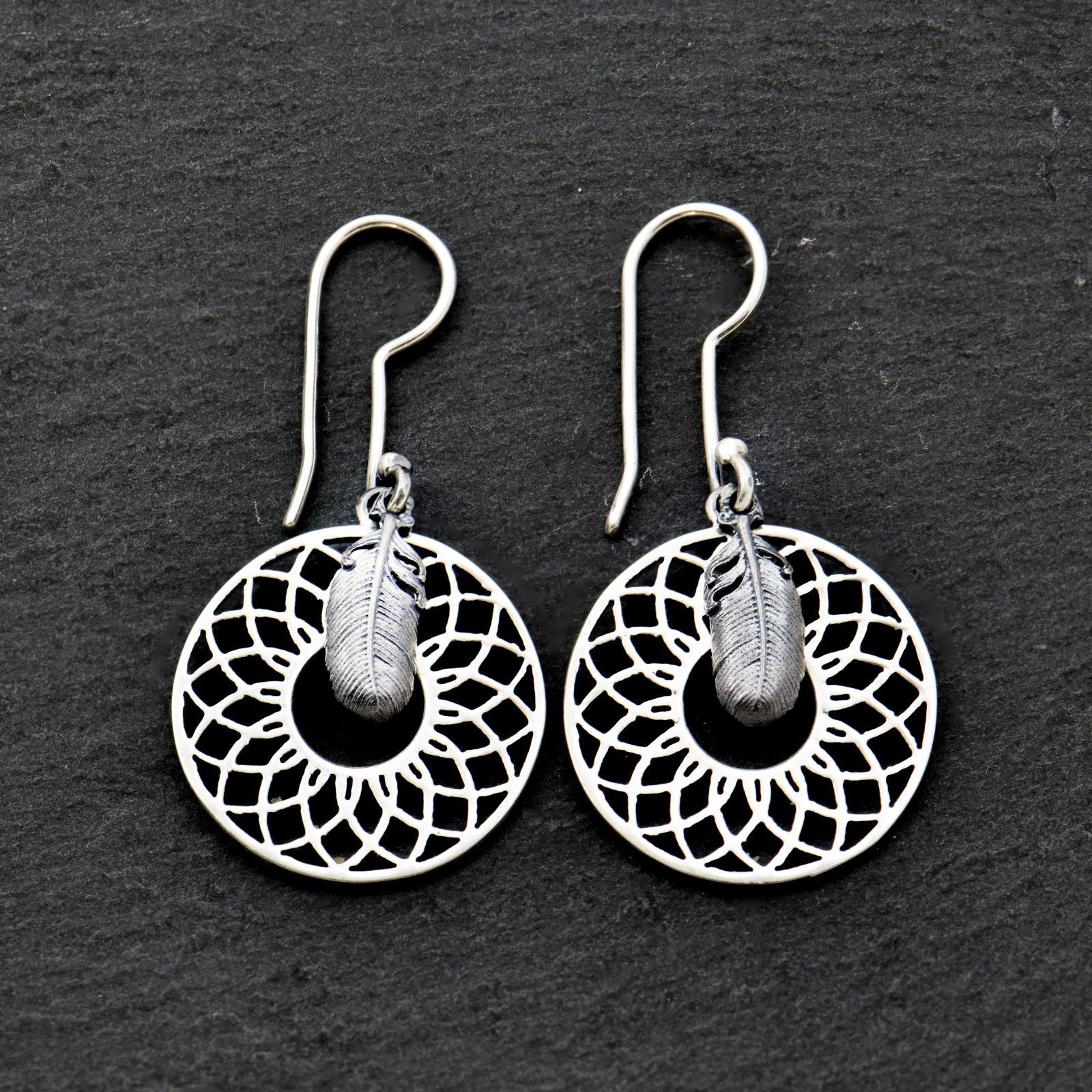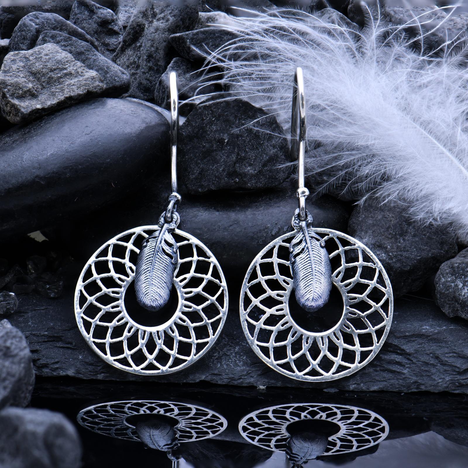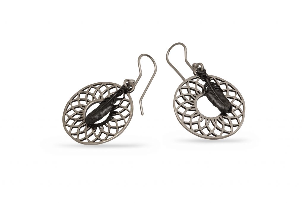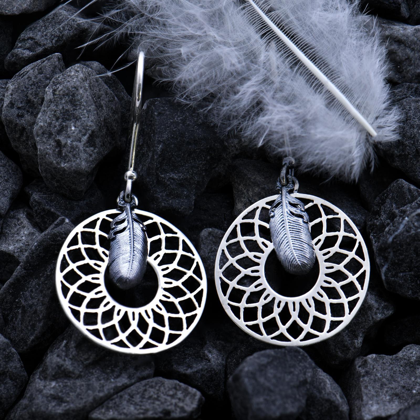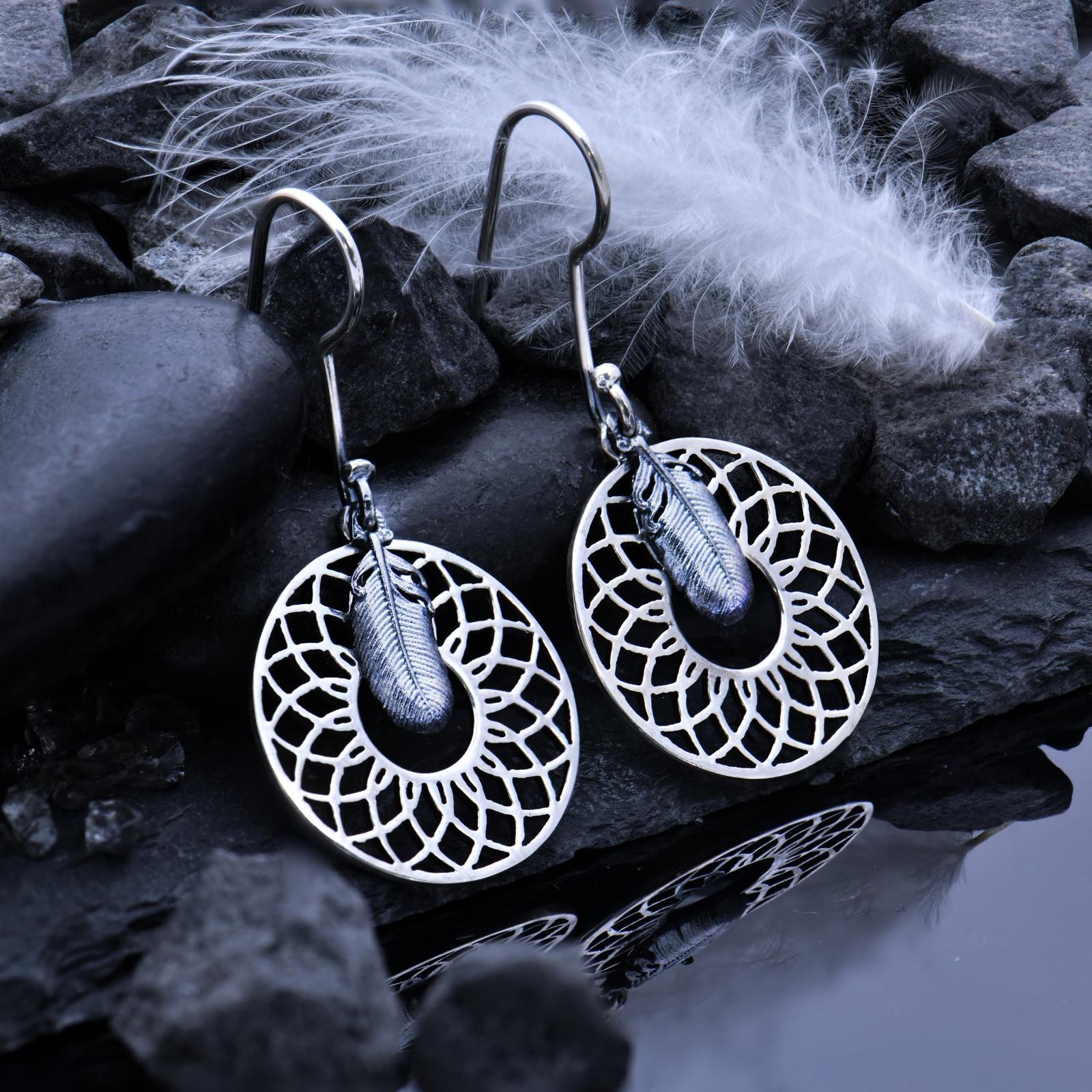 ДАМСКИ СРЕБЪРНИ ОБЕЦИ “ЛОВЕЦ НА СЪНИЩА”. Сребърни обеци в кръгла форма и свободно движещо се перо с цветен родий – изобразяващи капани за сънища.