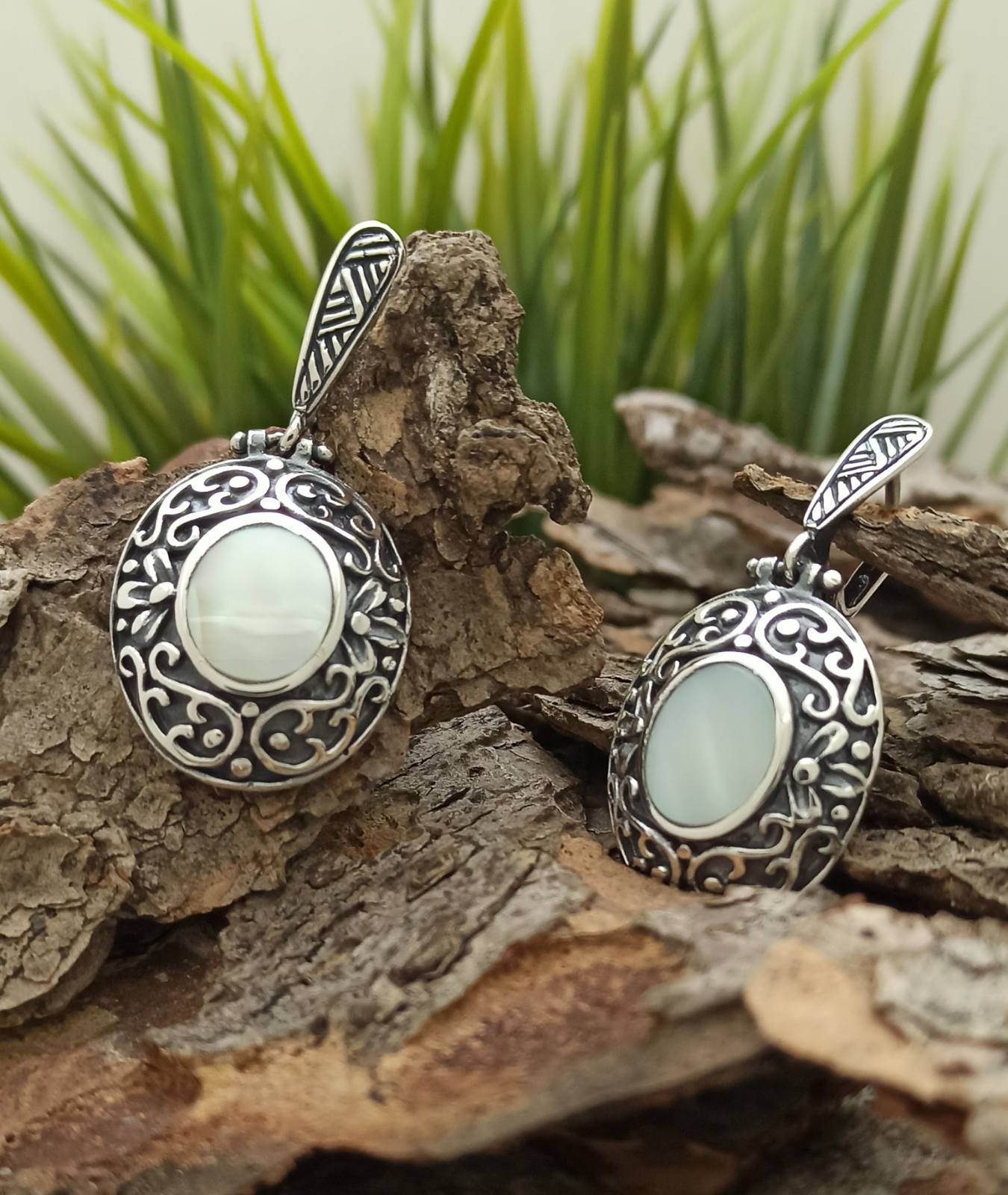 Обиците са част от комплект сребърни бижута, коѝто са подходящи за подарък на жена. Висящи сребърни обеци с бял седеф и закопчаване тип английско. Дамски обеци от сребро произведени във фабрика за сребърна бижутерия Студио Николас, от сребро с проба и маркировка 925.