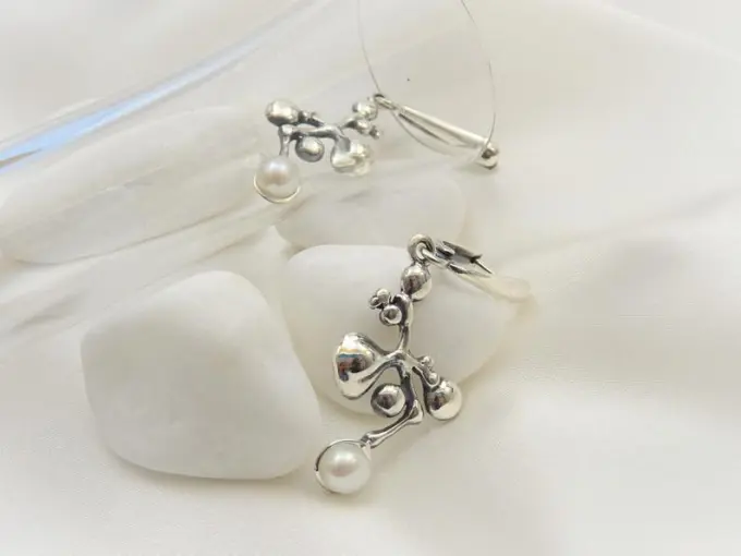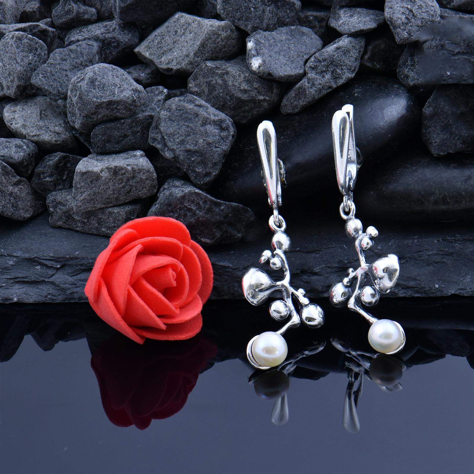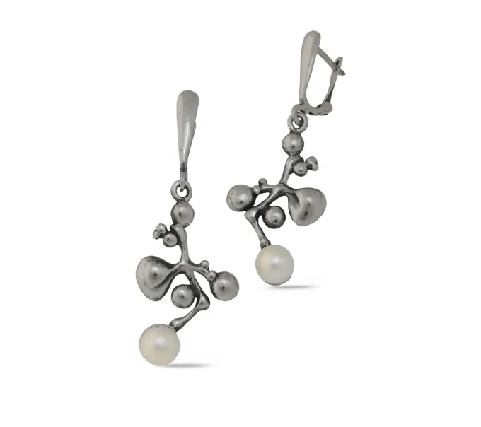 Дамски сребърни обеци “Камелия” с нестандартна форма и завършващ елемент – инкрустирана речна перла на “Английско” закопчаване. Сребърна бижутерия за жени – Студио Николас.
