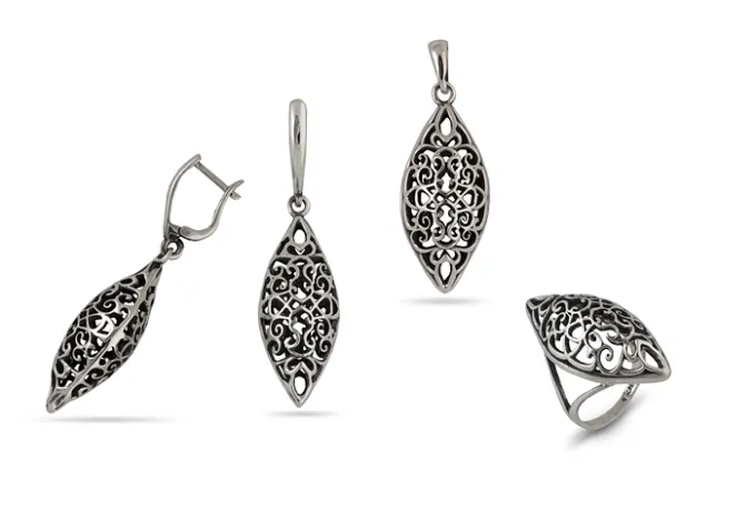 Дамски сребърни обеци 1212E. Висящи и масивни ажурени обици от сребро с проба 925 и с перфектна ръчна изработка, авторски модел на Студио Николас. Български производител на сребърна бижутерия. Прекрасен подарък за любима жена. Част от сребърен комплект бижута: пръстен, обеци и медальон.