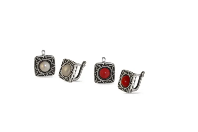 Дамски сребърни обеци “Тетида” 1151E в квадратна форма с гравюри и инкрустирана речна перла, “английско” закопчаване. Възможни цветове на перлите – бял или червен. Nikol@s е изкуството, с внимание към всеки детайл. Ръчна изработка, 925 проба, сребърна красота!