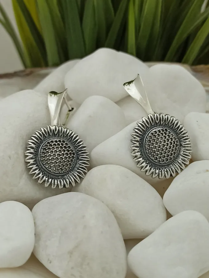 Дамски сребърни обеци “СЛЪНЧОГЛЕД”, авторски модел на Студио Николас – български производител на бижутерия от сребро предназначена за мъже, жени и деца.  Студиото разполага със собствена фабрика за ръчно изработени накити от сребро 925
