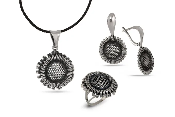 Дамски сребърен медальон „Слънчоглед“. Слънчогледът символизира вярност и постоянство. Освен това, тъй като много прилича на слънцето, се свързва с топлина и щастие. Дамски сребърен медальон „Слънчоглед“ от Студио Николас – произведен от сребро с проба 925.  Комплект с пръстен и обеци, сребърни бижута от сребро 925 за подарък за любимата жена и майка.Бижутата със смисъл не само изглеждат зашеметяващи, но носят и по-дълбоко значение.
