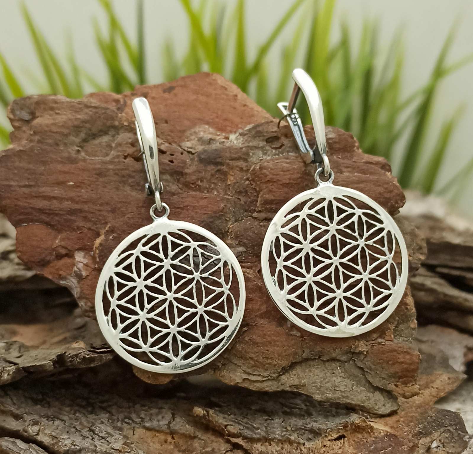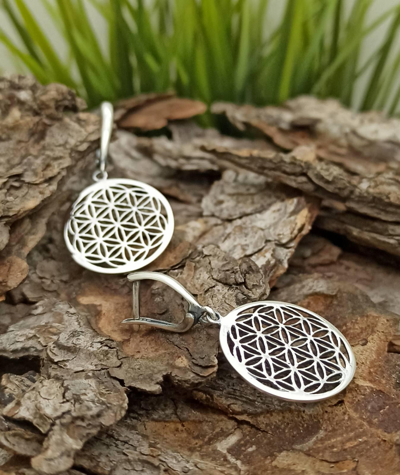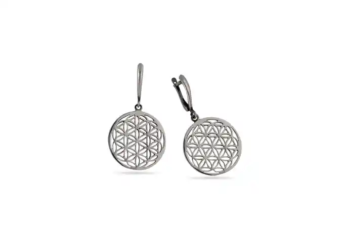 Сребърни обеци „Цветето на живота“ с родиево покритие изобразяващи „цветето на живота“, окачването е тип английско или кука. Сребърна проба 925 Ag. „Цветето на Живота“ е основната фигура в Свещената геометрия. Съдържа всички символи, букви, цифри и знаци от живота в себе си. Фигури, който са наука и изкуство, и музика в едно.