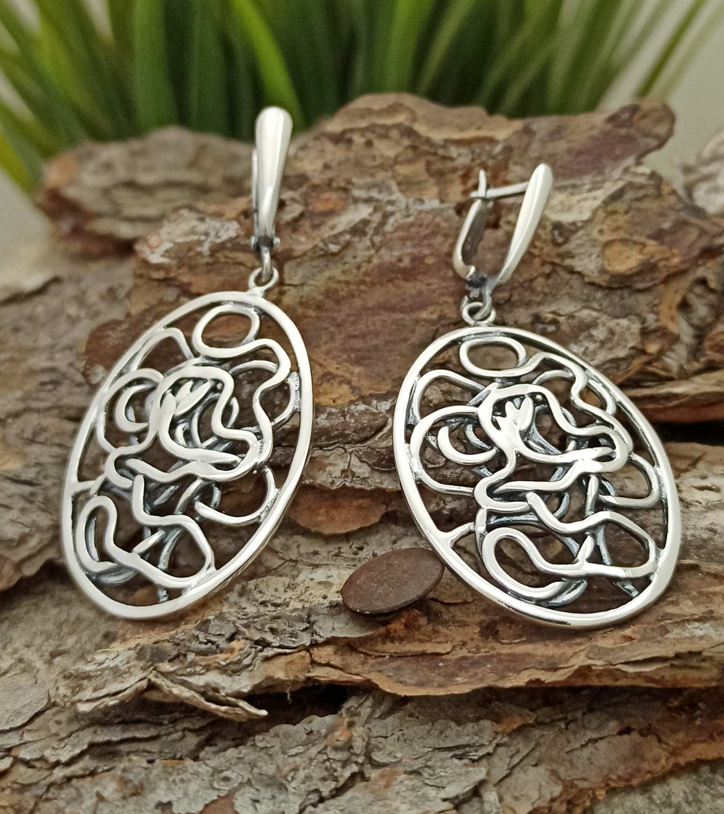 Дамски сребърни обеци 905E – английско закопчаване, във формата на елипса и оригинално преплетени орнаменти.Nikol@s е изкуството, с внимание към всеки детайл. Ръчна изработка, 925 проба, сребърна красота. Ажурни сребърни обеци!
