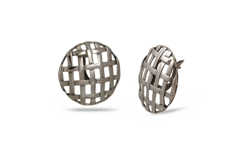 Дамски сребърни обеци, стилно преплетени като решетка, модел 635E от Студио Николас, български производител на сребърна бижутерия. Проба 925 Sterling Silver.Възможност за избор на закопчаването: “английско” или с щифт.