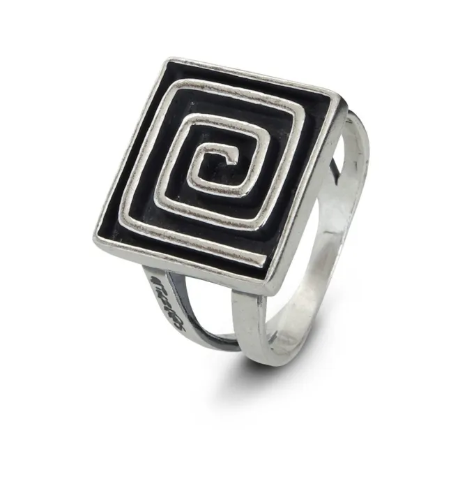 Дамски сребърен пръстен с кръгла плочка и закачлива завъртулка от сребро напомняща на символ ИН-ЯН. Модел 485R от Студио Николас. Nikol@s е изкуствoто, с внимание към всеки детайл. Красиви стилни масивни дизайнерски сребърни пръстени за жени от производител на накити Студио Николас. Ръчна изработка, 925 пробa, сребърна красота!Дамски сребърен пръстен „Спирала“ 485R.
