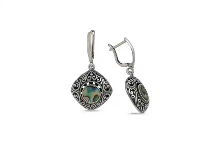 Дамски сребърни обеци със седеф, модел 1396E от Студио Николас – български производител на бижута от сребро и седеф (кралски, бял и черен). Вярва се, че седефа е символ на душевната чистота и красота. Седефът символизира женското начало, грижи се за спокойствието и семейството.