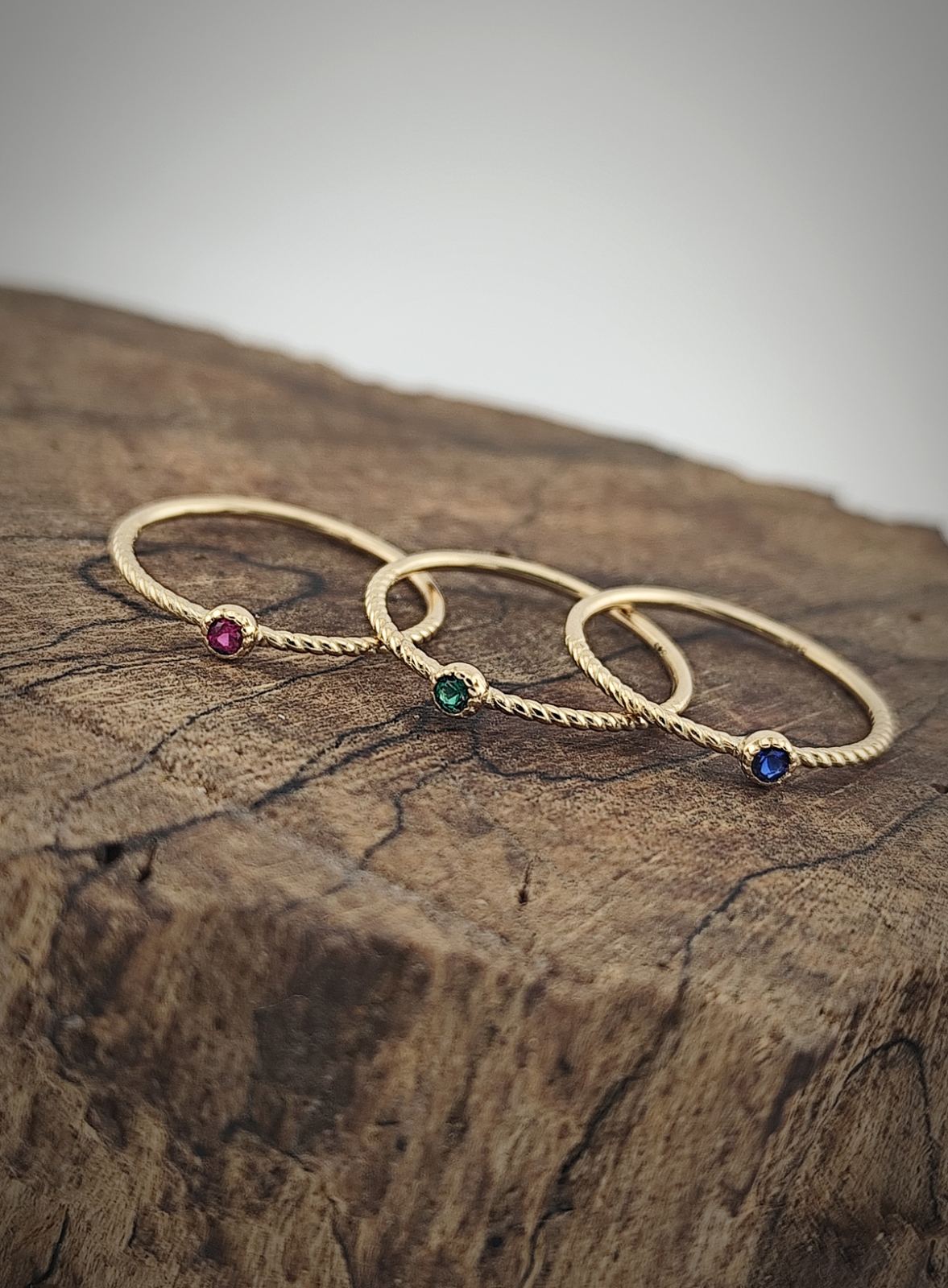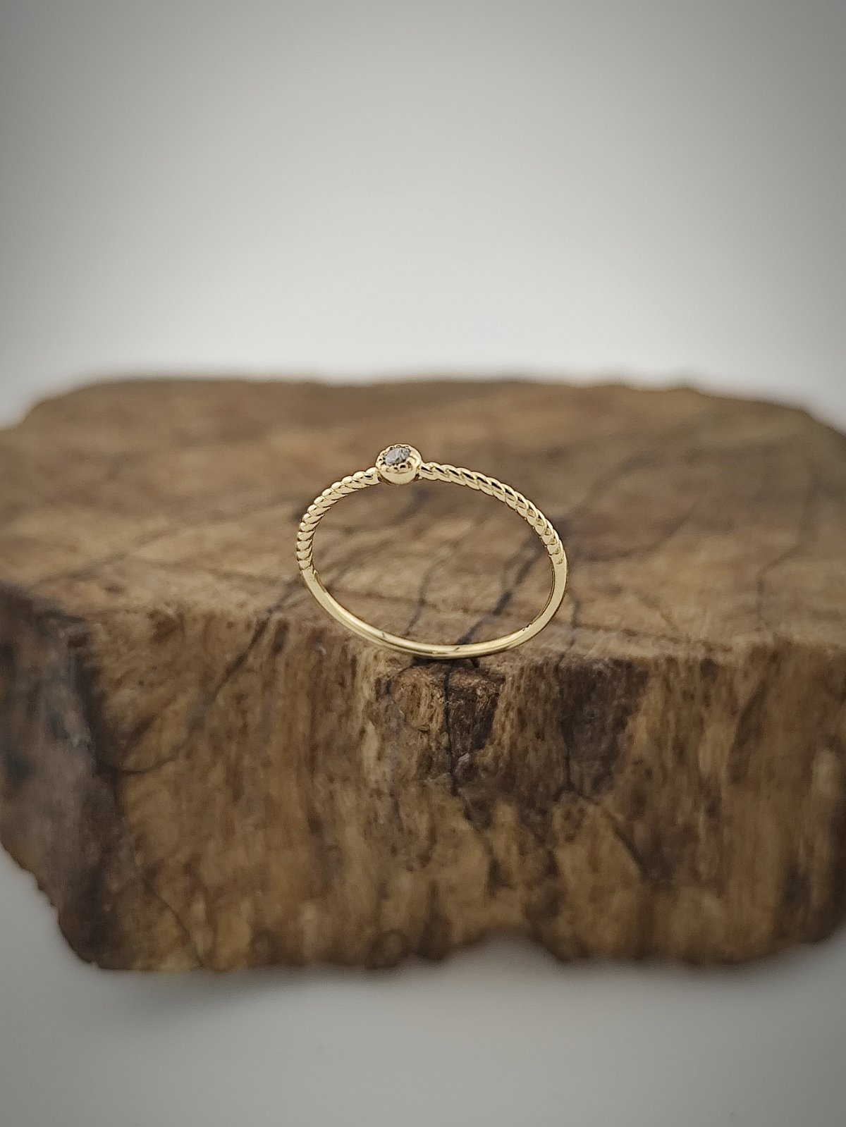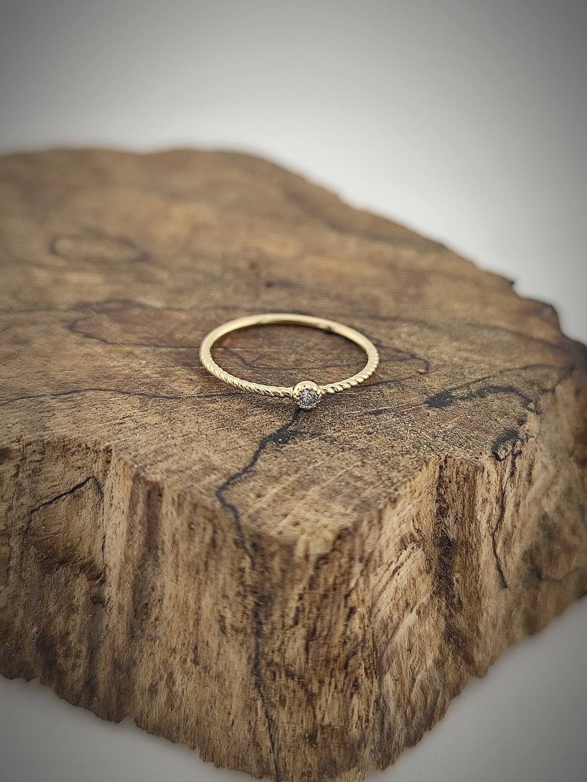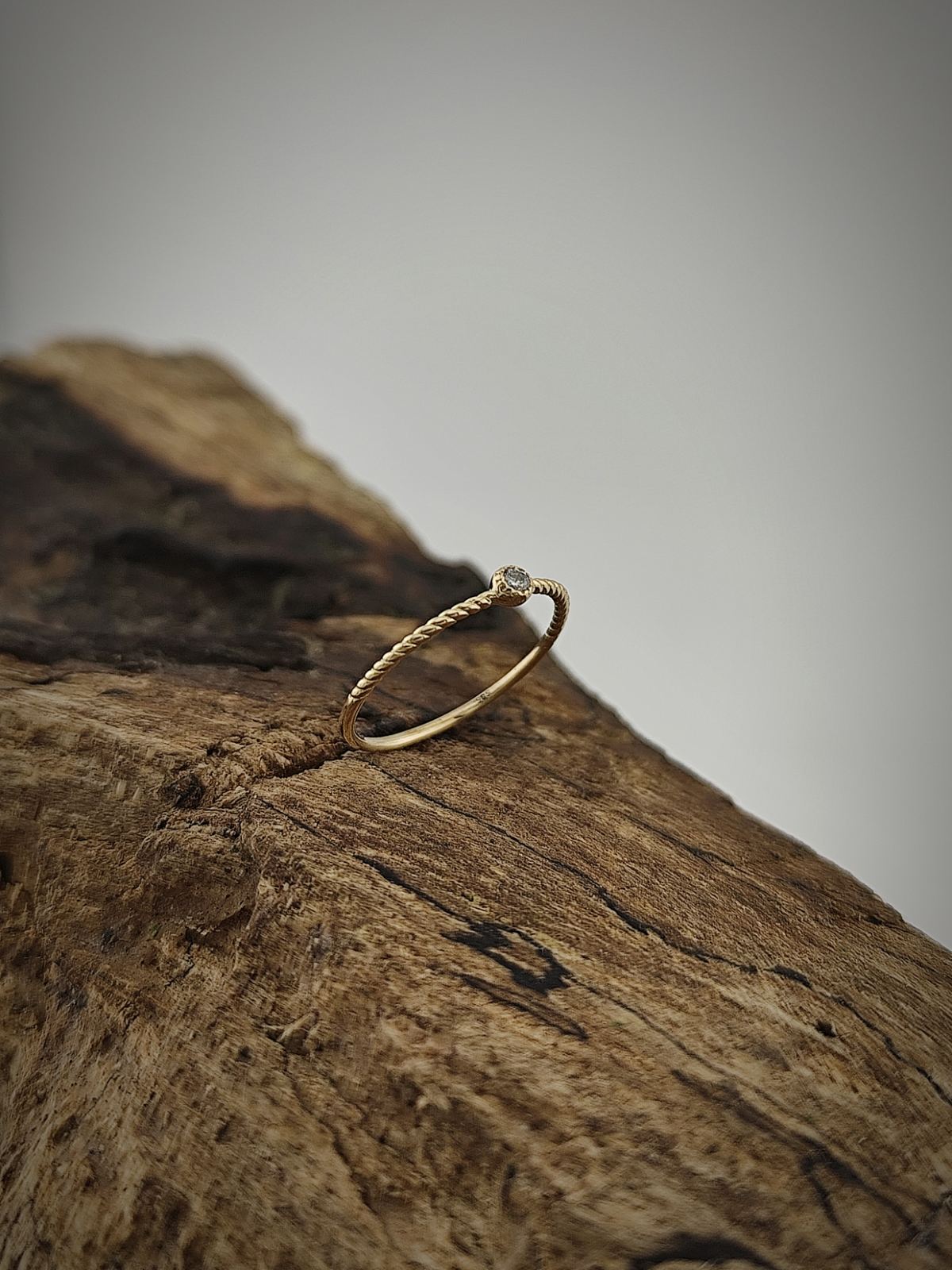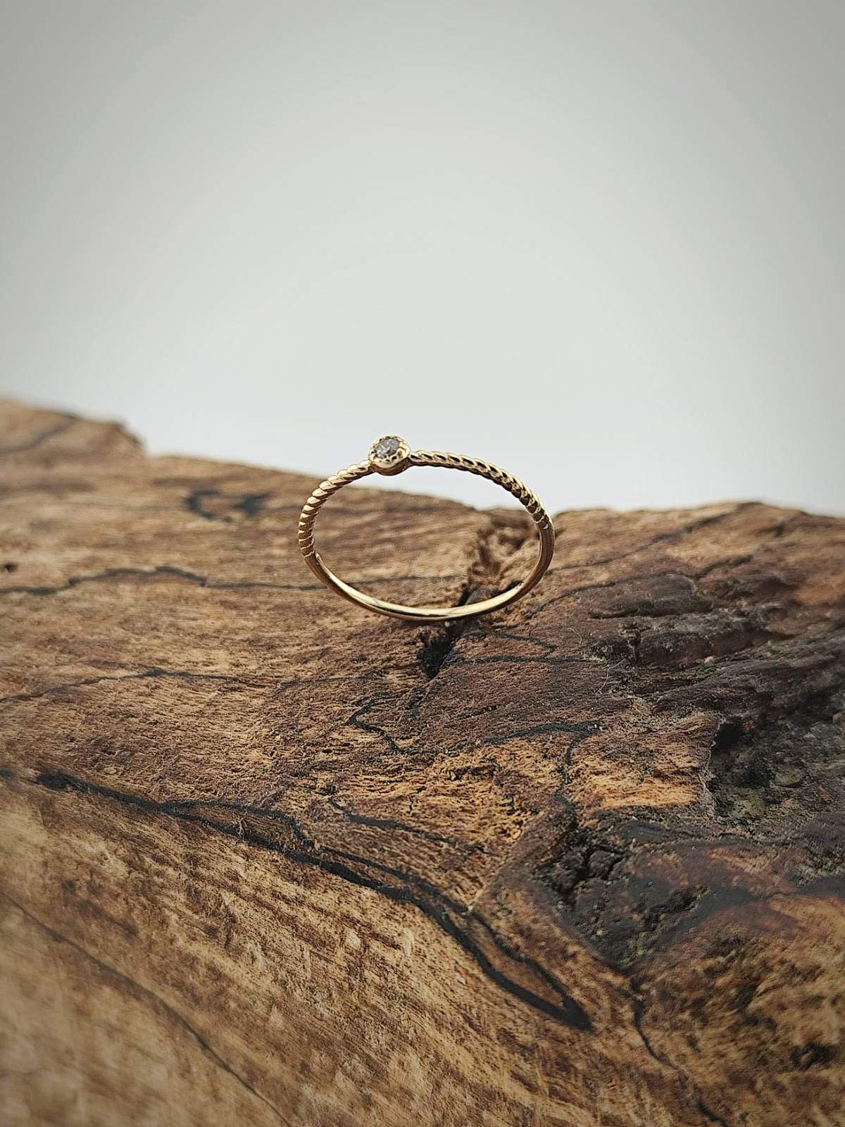 Халката е с леко усукана форма, придаваща динамика и меко визуално движение. В нея е вграден деликатен циркон, който служи като светлинна точка – фокусен детайл, носещ нежност и блясък. Моделът е подходящ за съчетаване с други пръстени от серията или за самостоятелно носене.