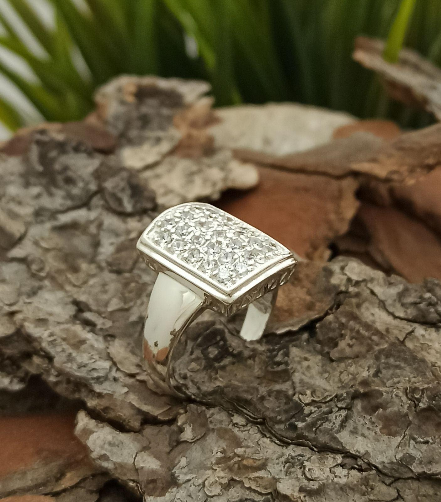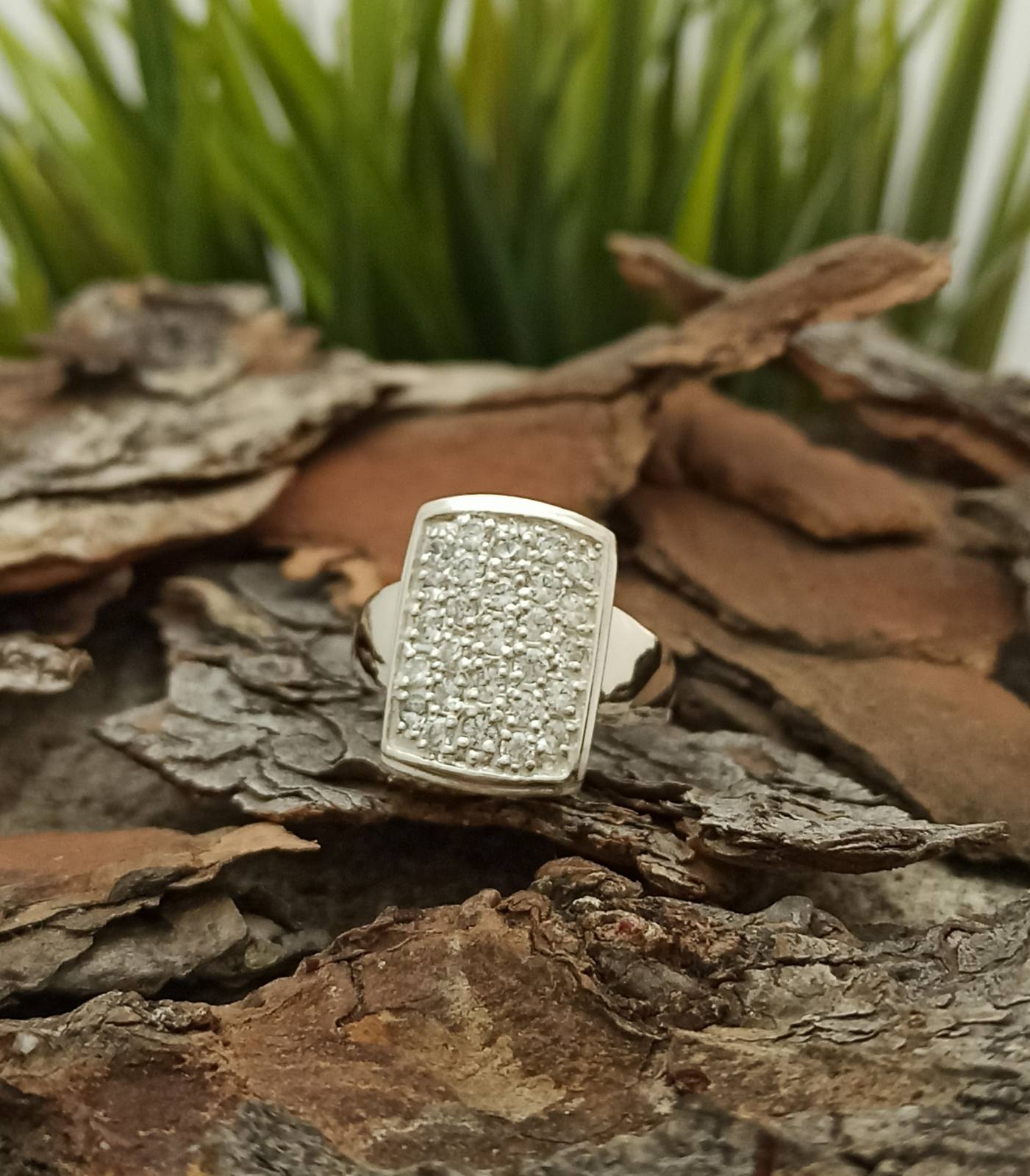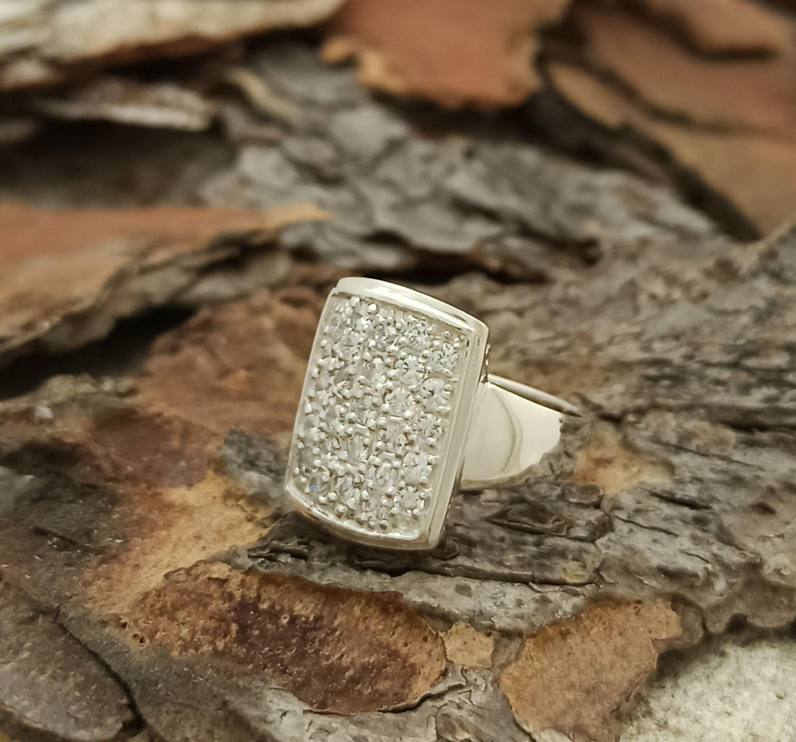 Дамски сребърен пръстен с прецизно монтирани 27 броя малки бели циркона, авторски модел 106R с перфектна ръчна изработка. Материала на бижуто е с 925 пробa – сребърна красота от Студио Николас.