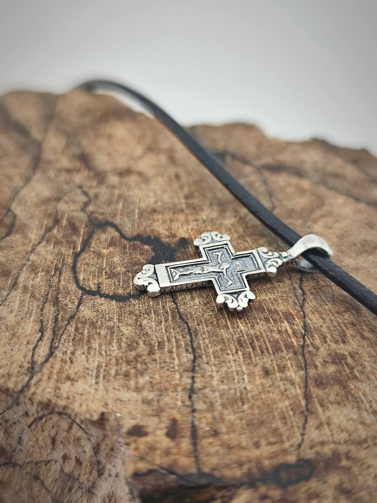 Сребърен кръст 1323M. Ръчно изработен двулицев медальон във формата на християнски кръст от сребро. Модел 1323M на фабрика за бижутерия Студио Николас. Български производител на сребърна бижутерия за мъже и жени.