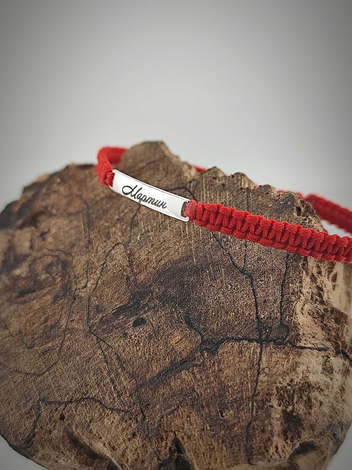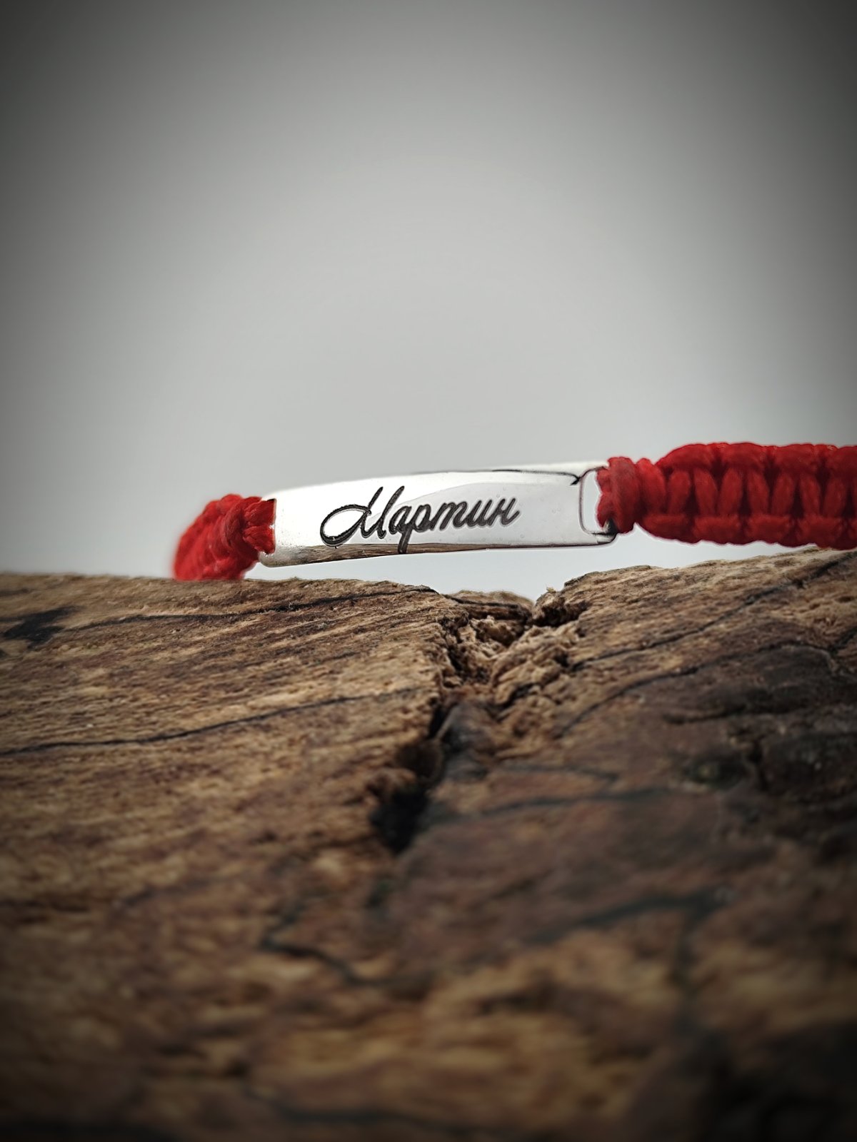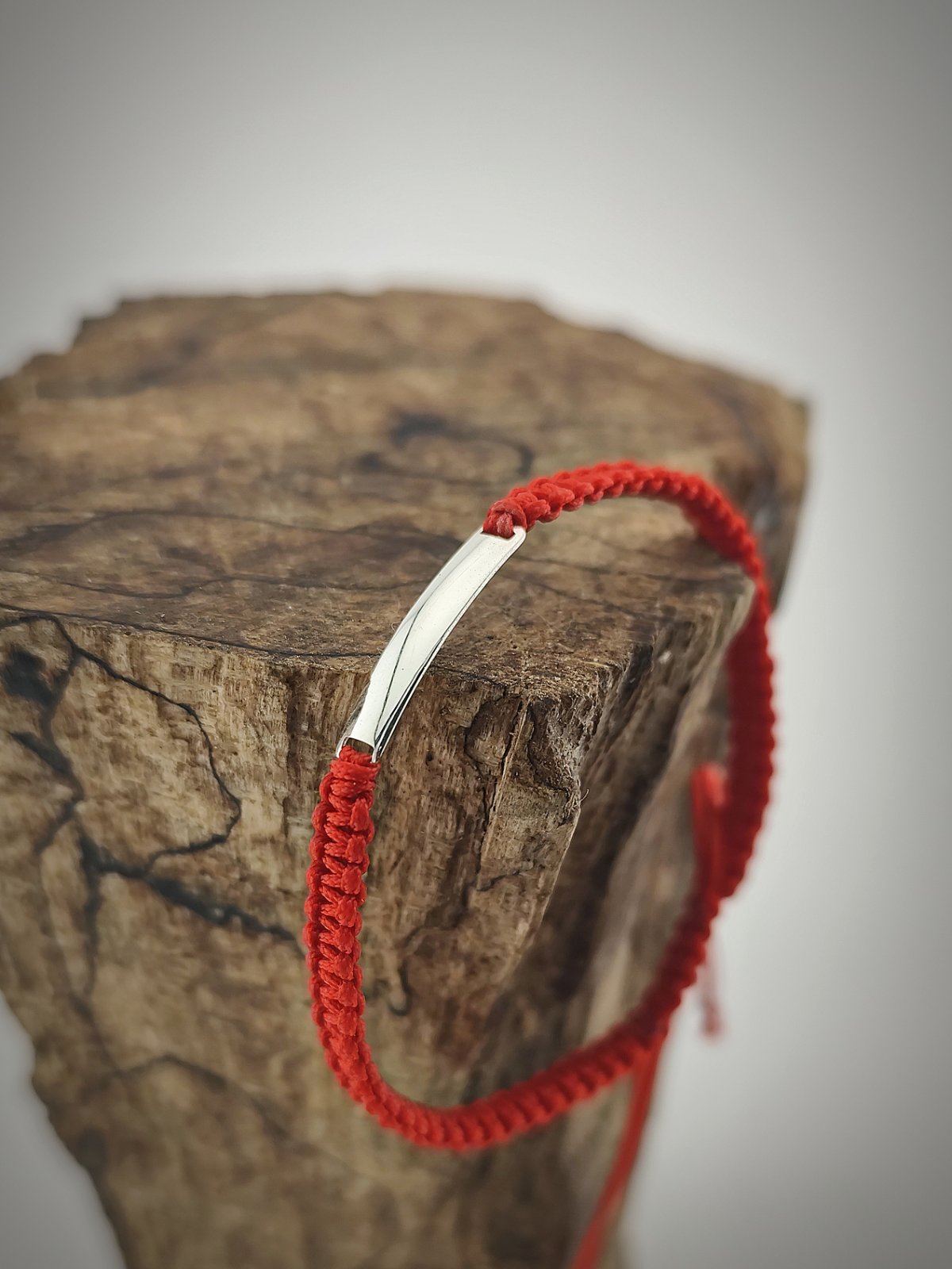 Плетена гривна с червен конец и сребърна плочка, върху която може да се гравира име, инициали, важна дата или дума с лично значение. Уникален аксесоар с емоционална стойност и елегантно излъчване.